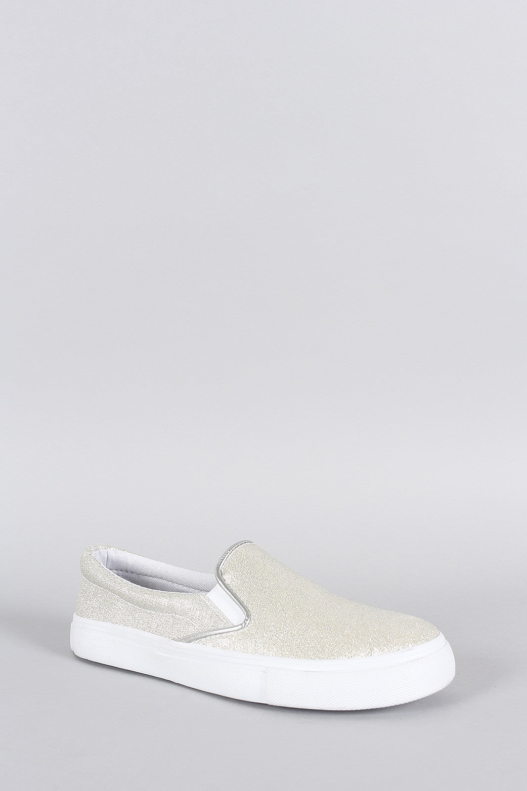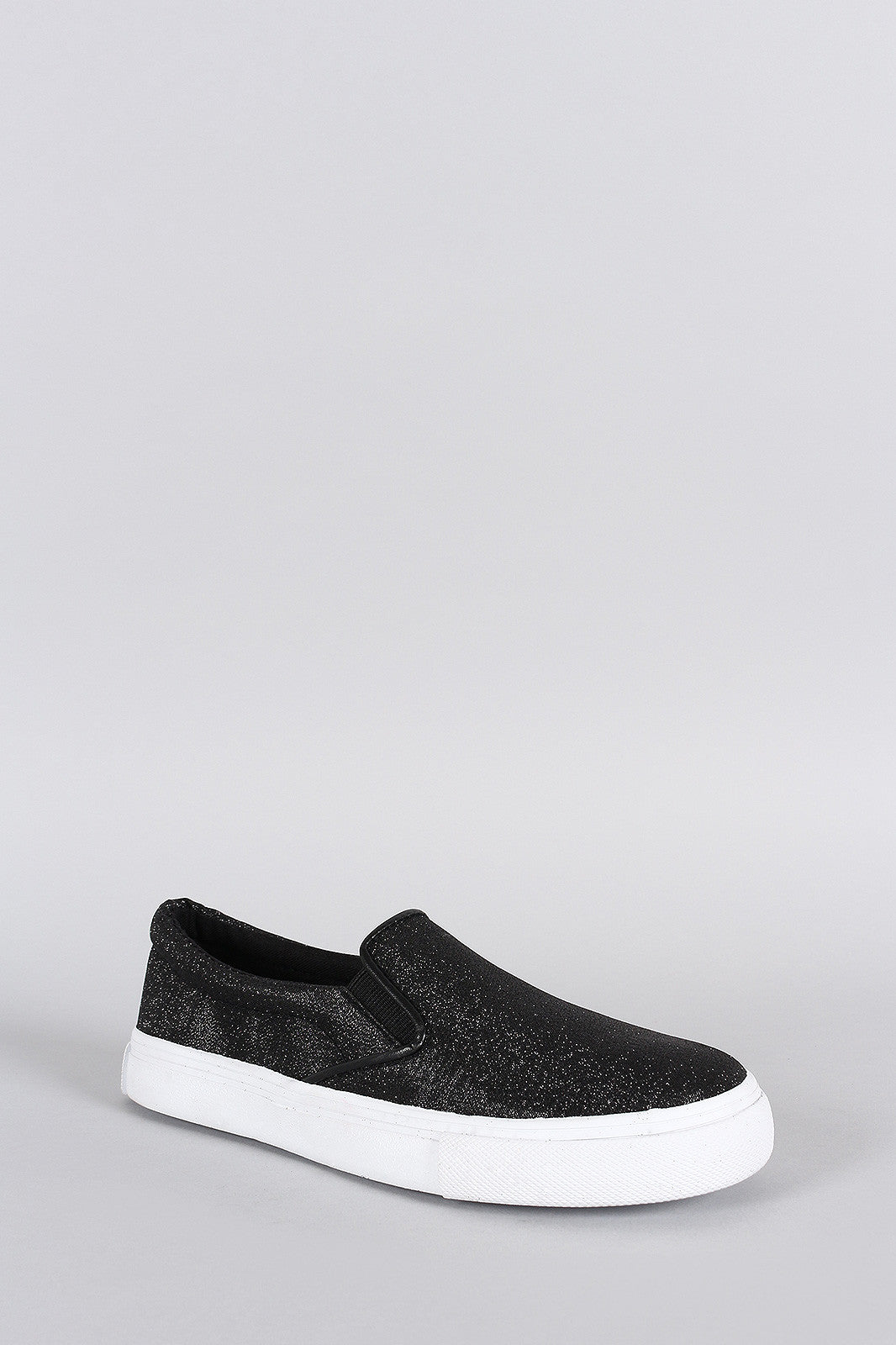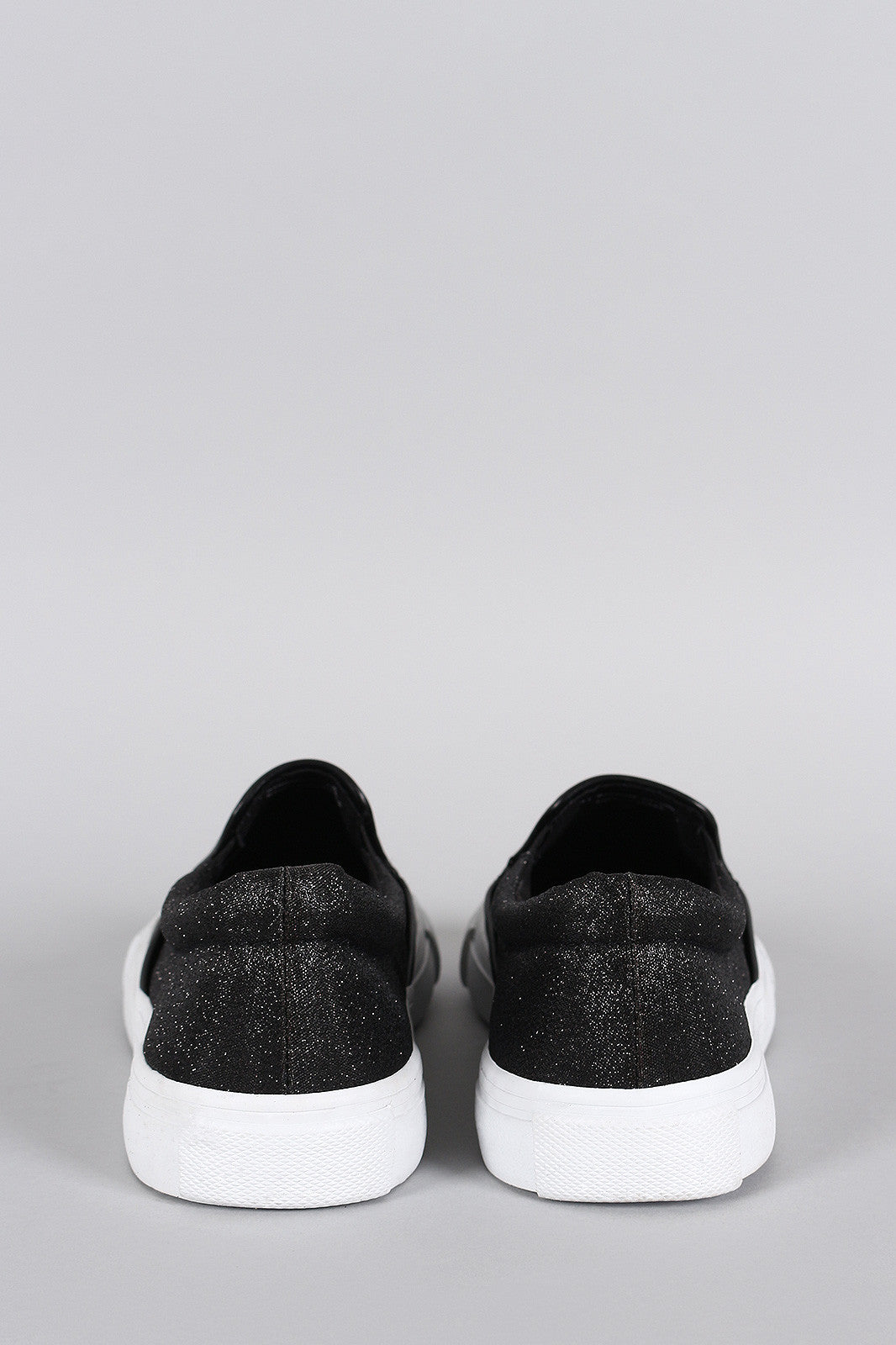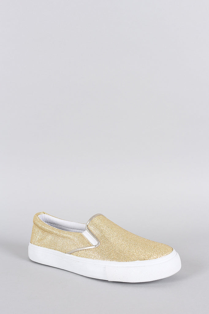 This casual sneaker features a sparkling glitter fabric upper, round toe, and piping detail. Finished with cushioned insole, double elastic gussets insert, and easy slip on style.Material: Fabric (man-made)Sole: Rubber