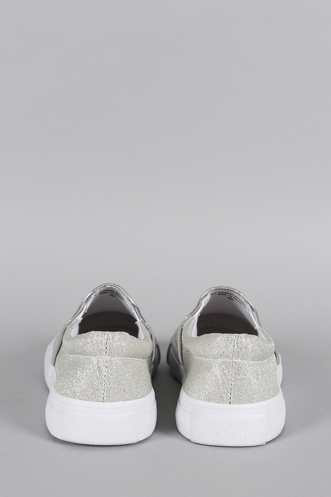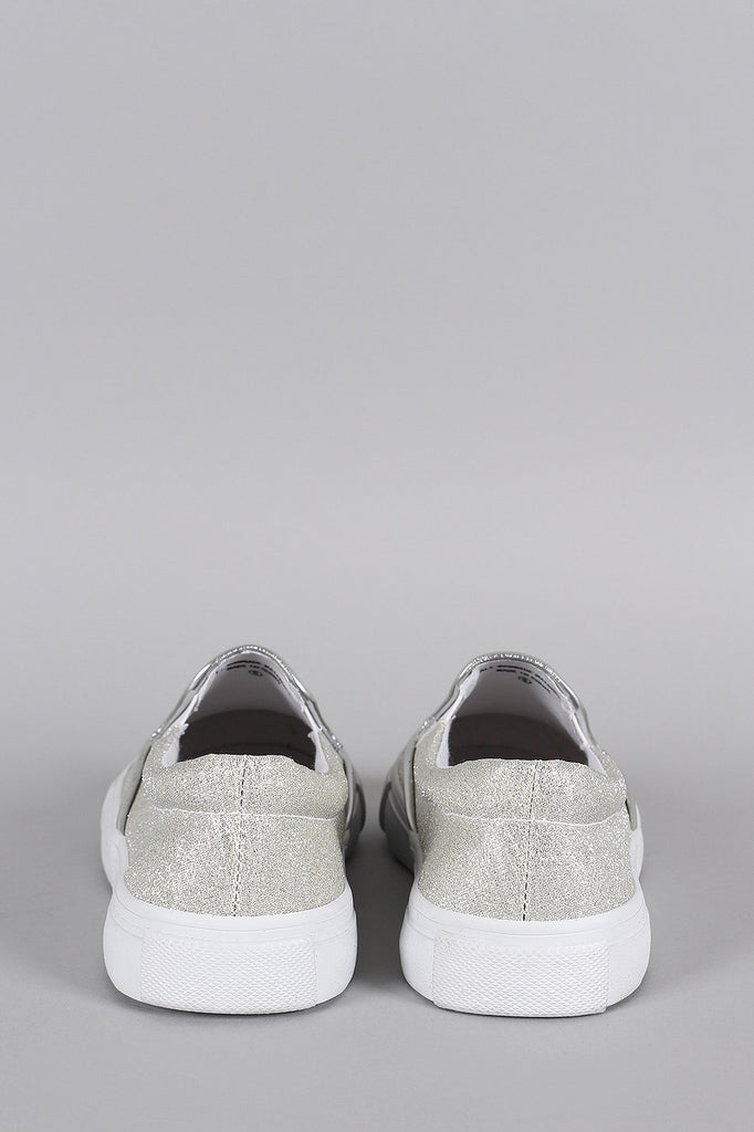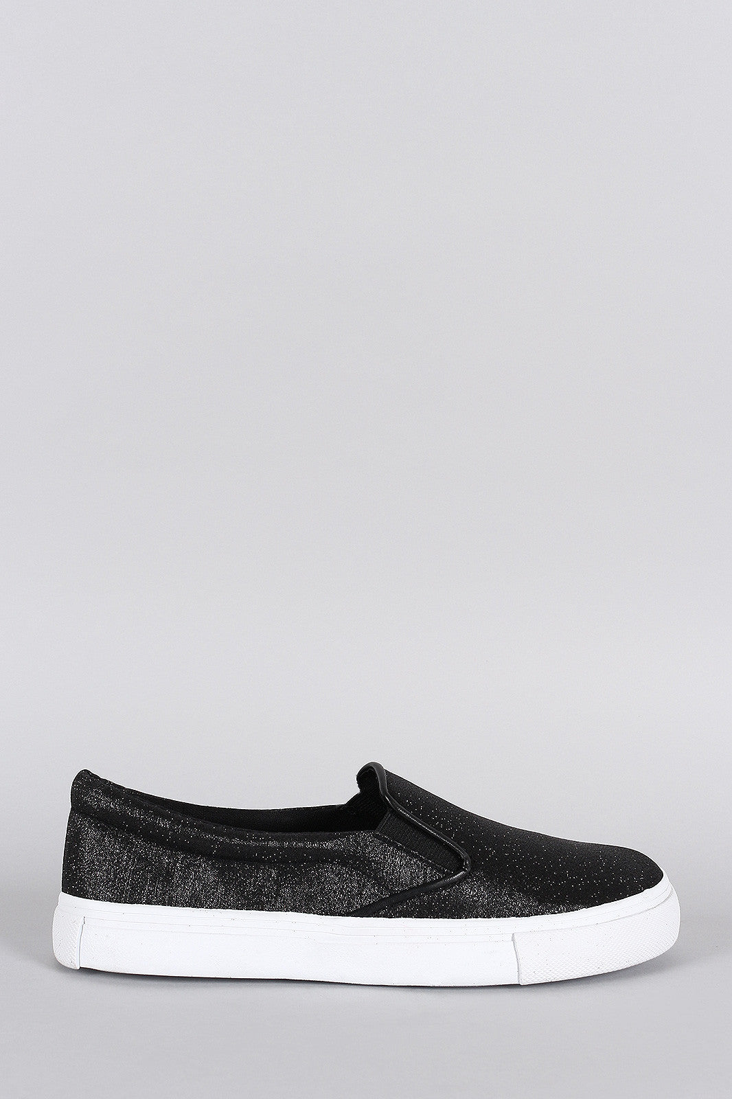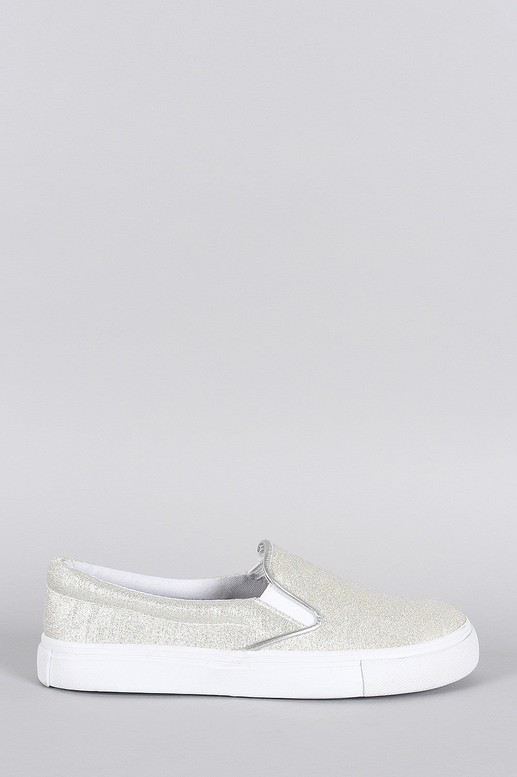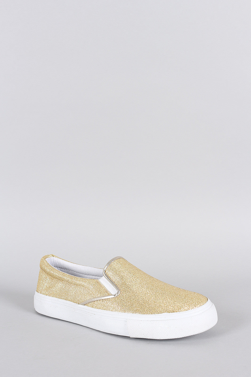 This casual sneaker features a sparkling glitter fabric upper, round toe, and piping detail. Finished with cushioned insole, double elastic gussets insert, and easy slip on style.Material: Fabric (man-made)Sole: Rubber