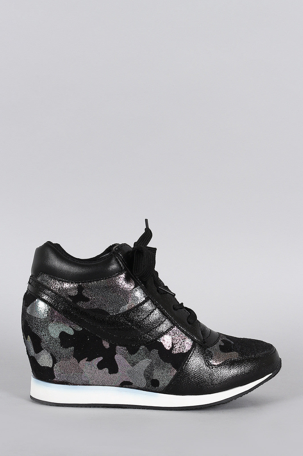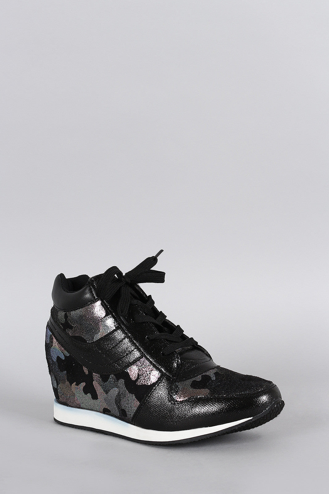This lace up sneaker was designed with a combination of a sold color and a glittered camouflage pattern. Designed with a hidden wedge and a cushioned high top.
