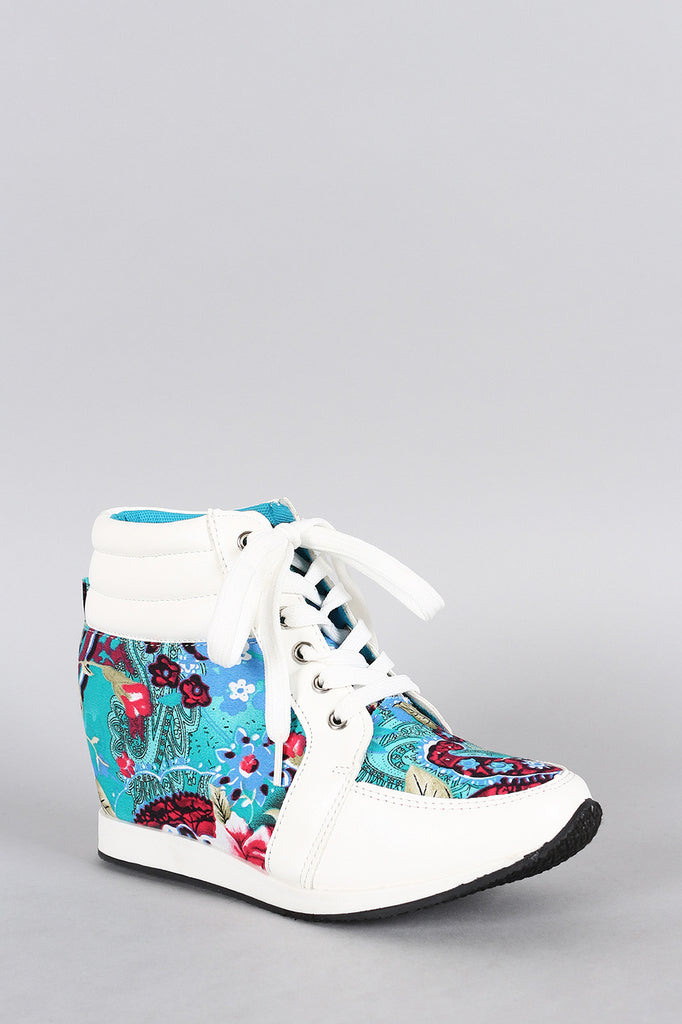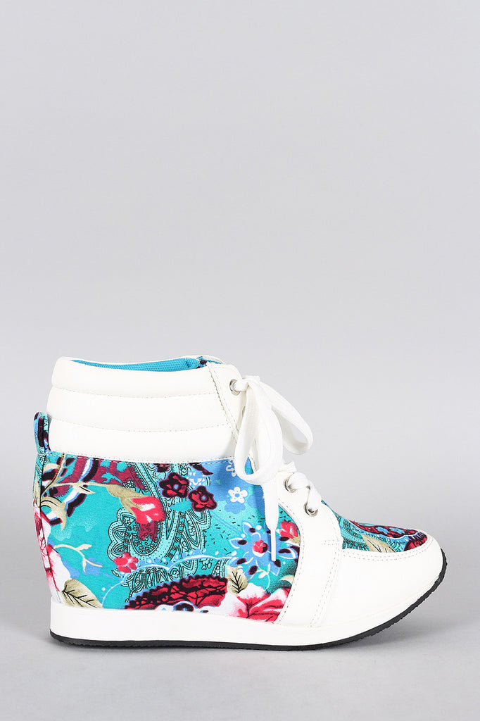 This fashionable wedge floral print fabric upper, round toe silhouette, and hidden wedge heel. Finished padded collar/tongue, cushioned insole, and lace up closure.