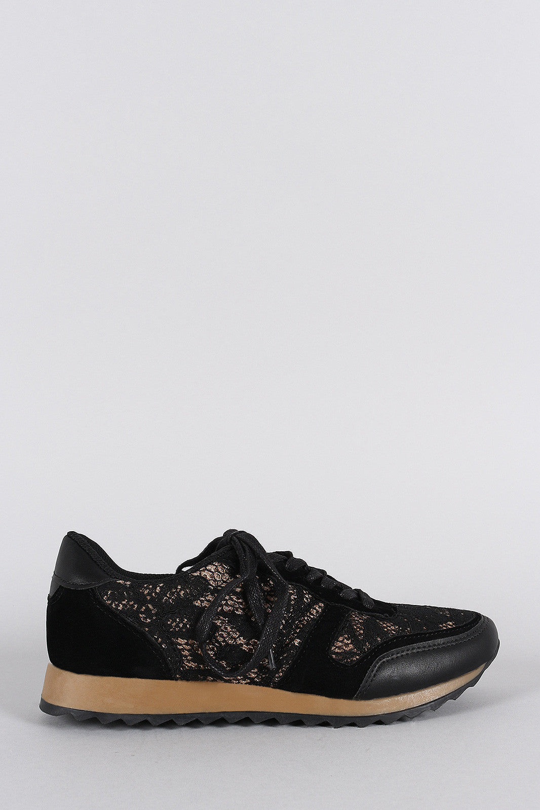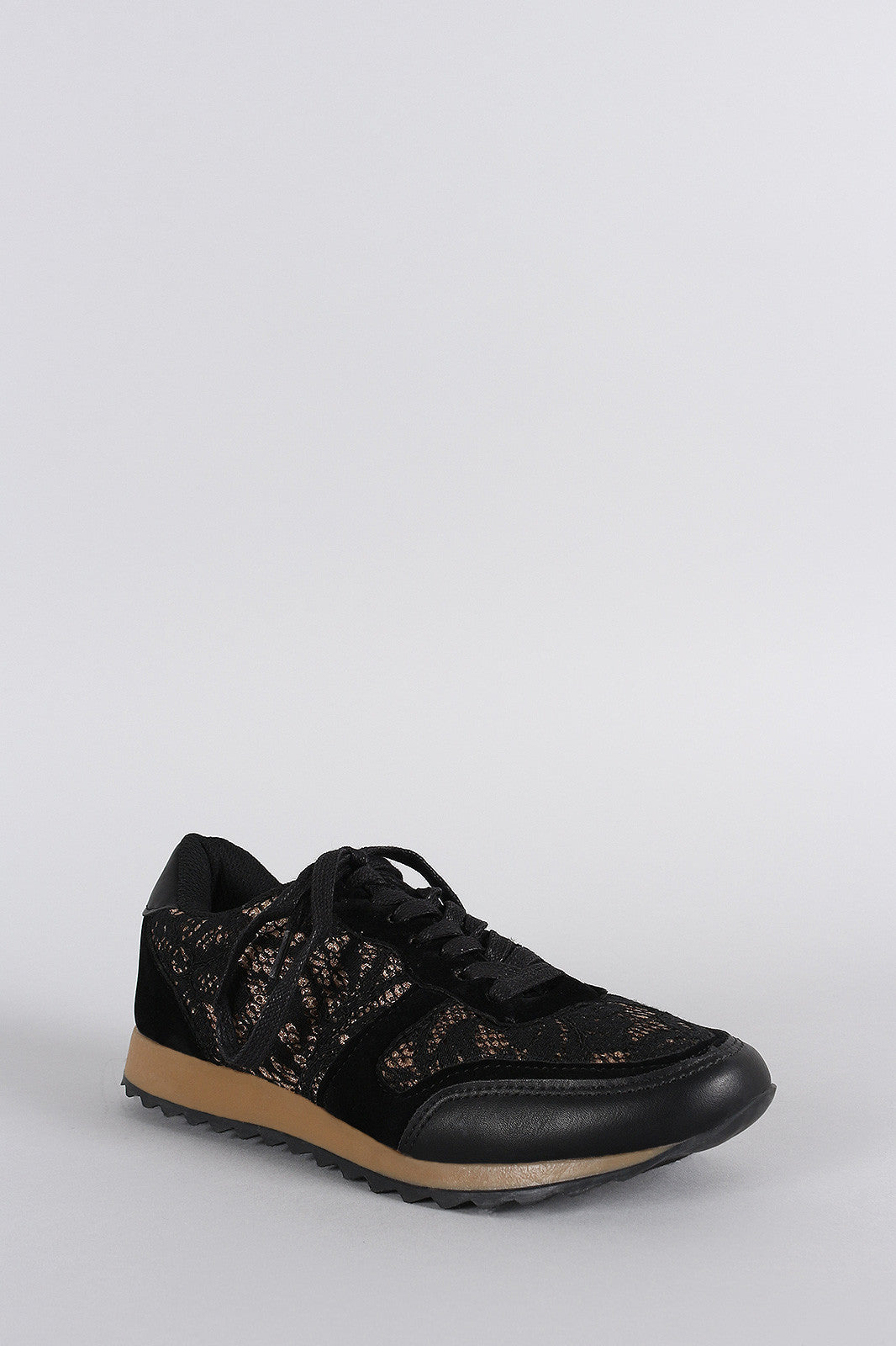 This sweet sneaker features a beautiful lace detail with metallic vegan leather trims, rounded toe, and top stitching accents. Finished with cushioned insole, padded collar/tongue, and lace up closure.Material: Lace/Vegan Leather (man-made)Sole: Rubber