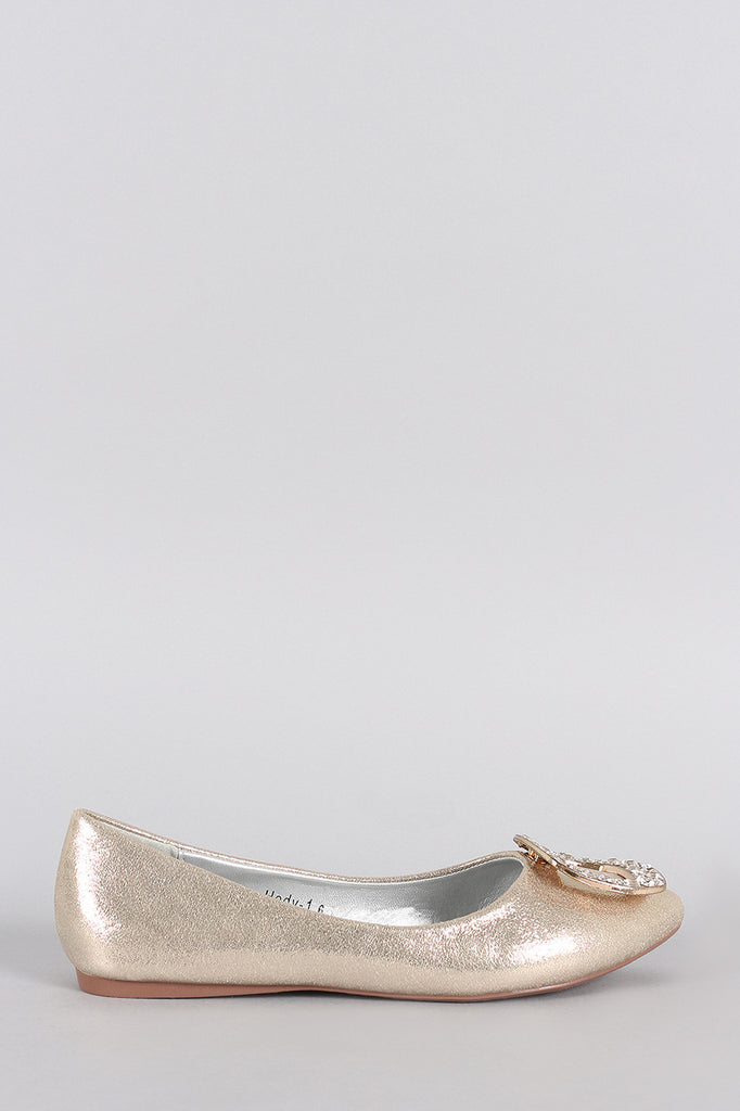 This pointy toe slip on silhouette. Designed with an alluring metallic plated square with a cluster of faux jewels.