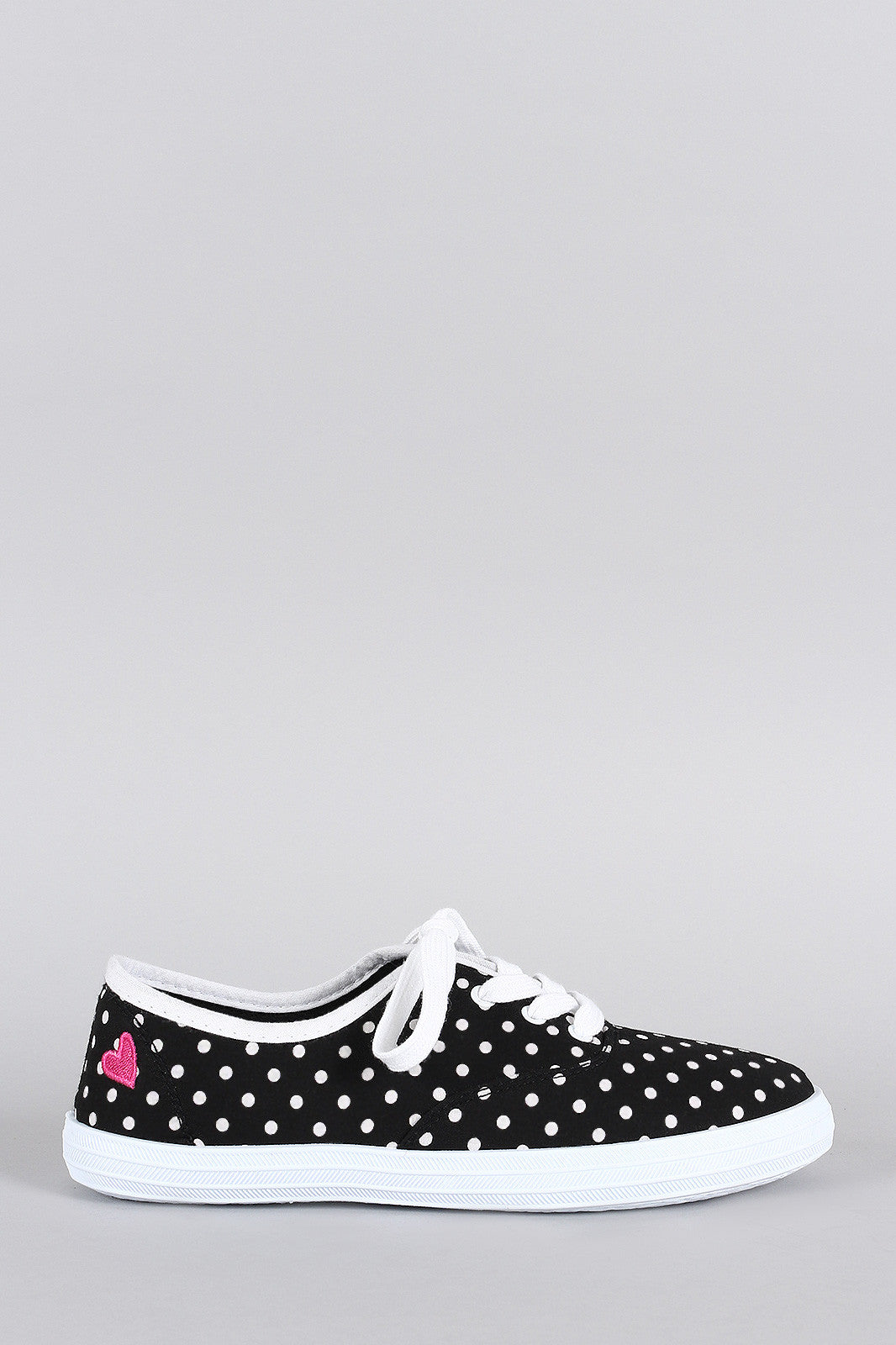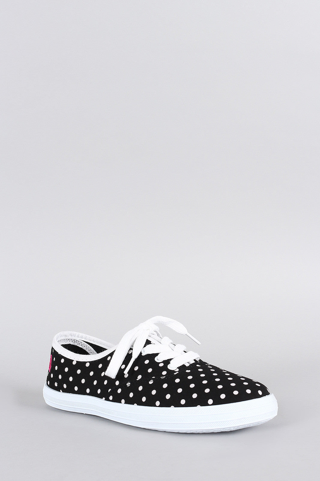 These fashionable polka dot print fabric, cushioned insole, and lace up closure.Material: Fabric (man-made)Sole: Rubber