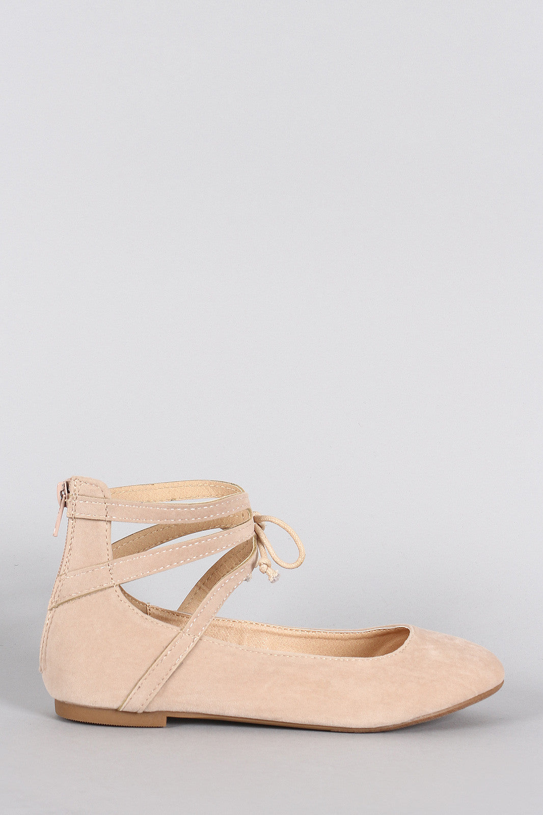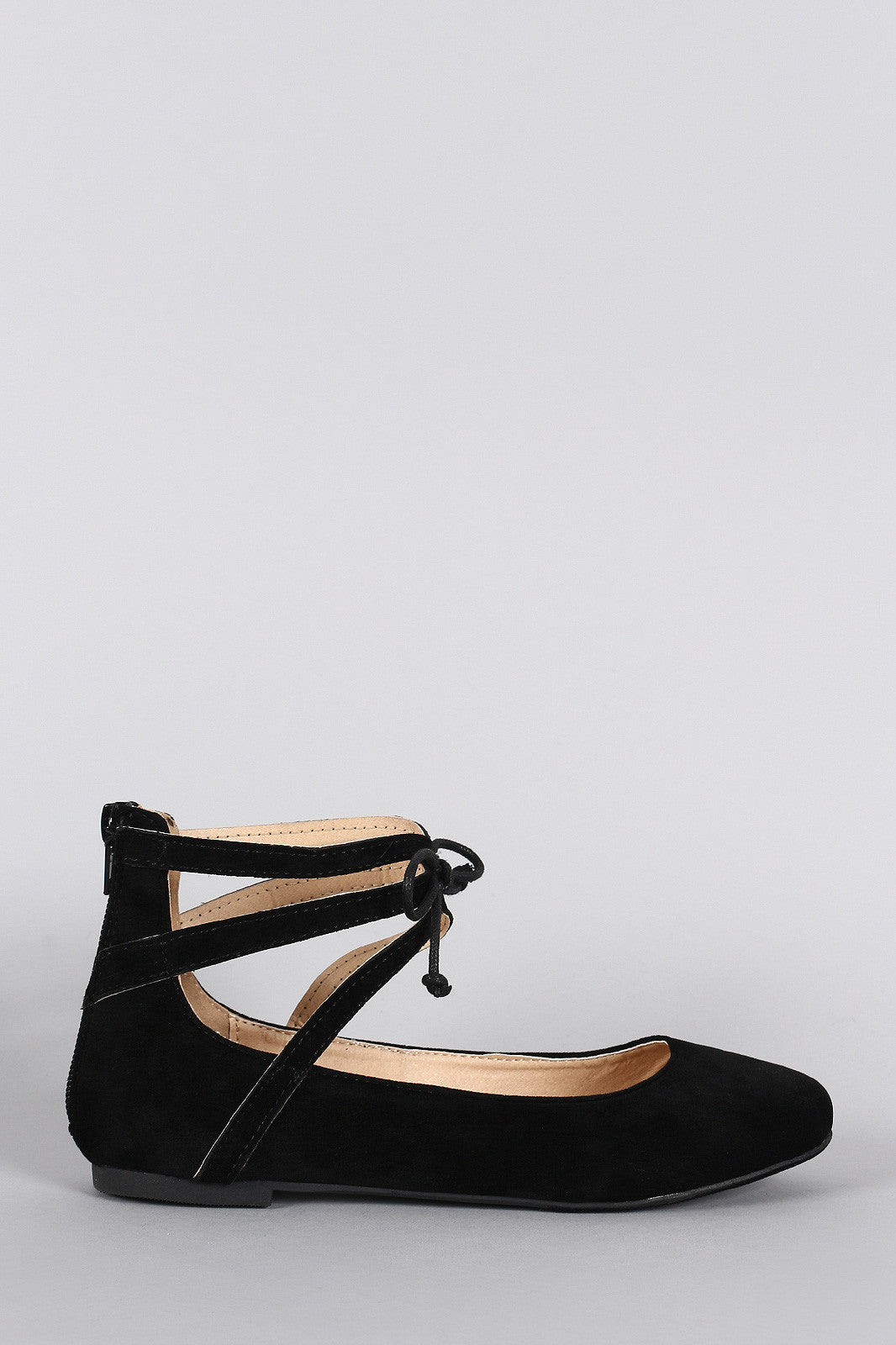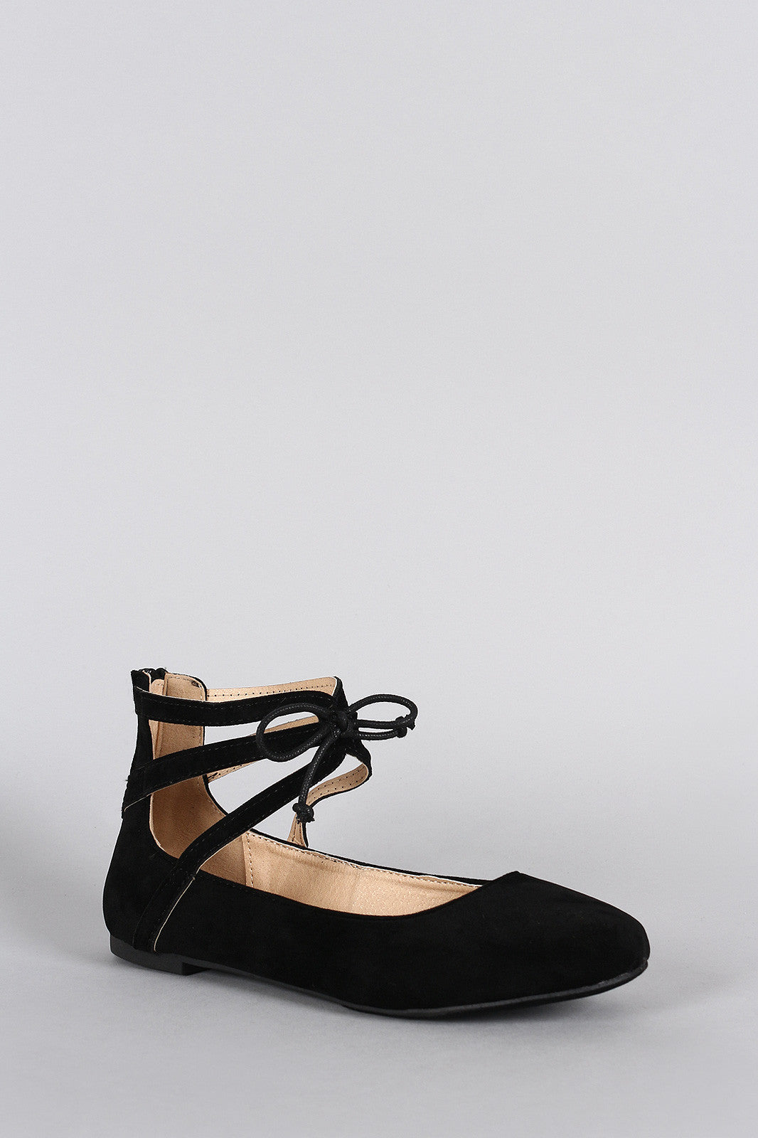 This gorgeous ballet flat features a round toe silhouette, strappy ankle cuff with bow tie accent, lightly padded insole, and rear zipper closure for easy on/off.Material: Vegan Suede (man-made)Sole: Rubber