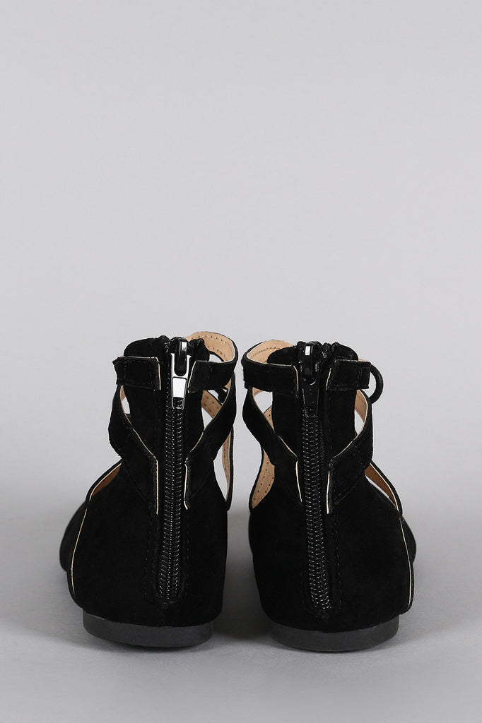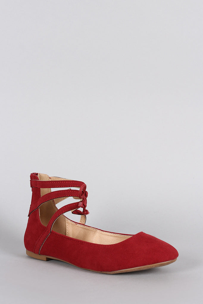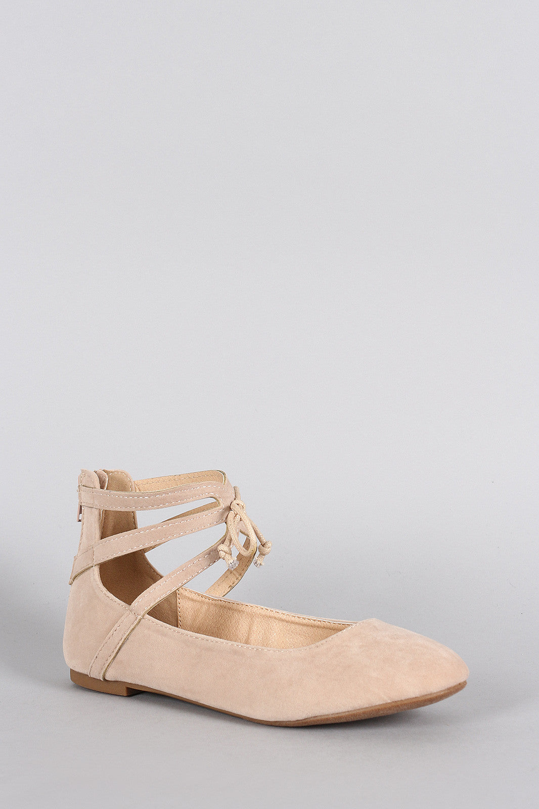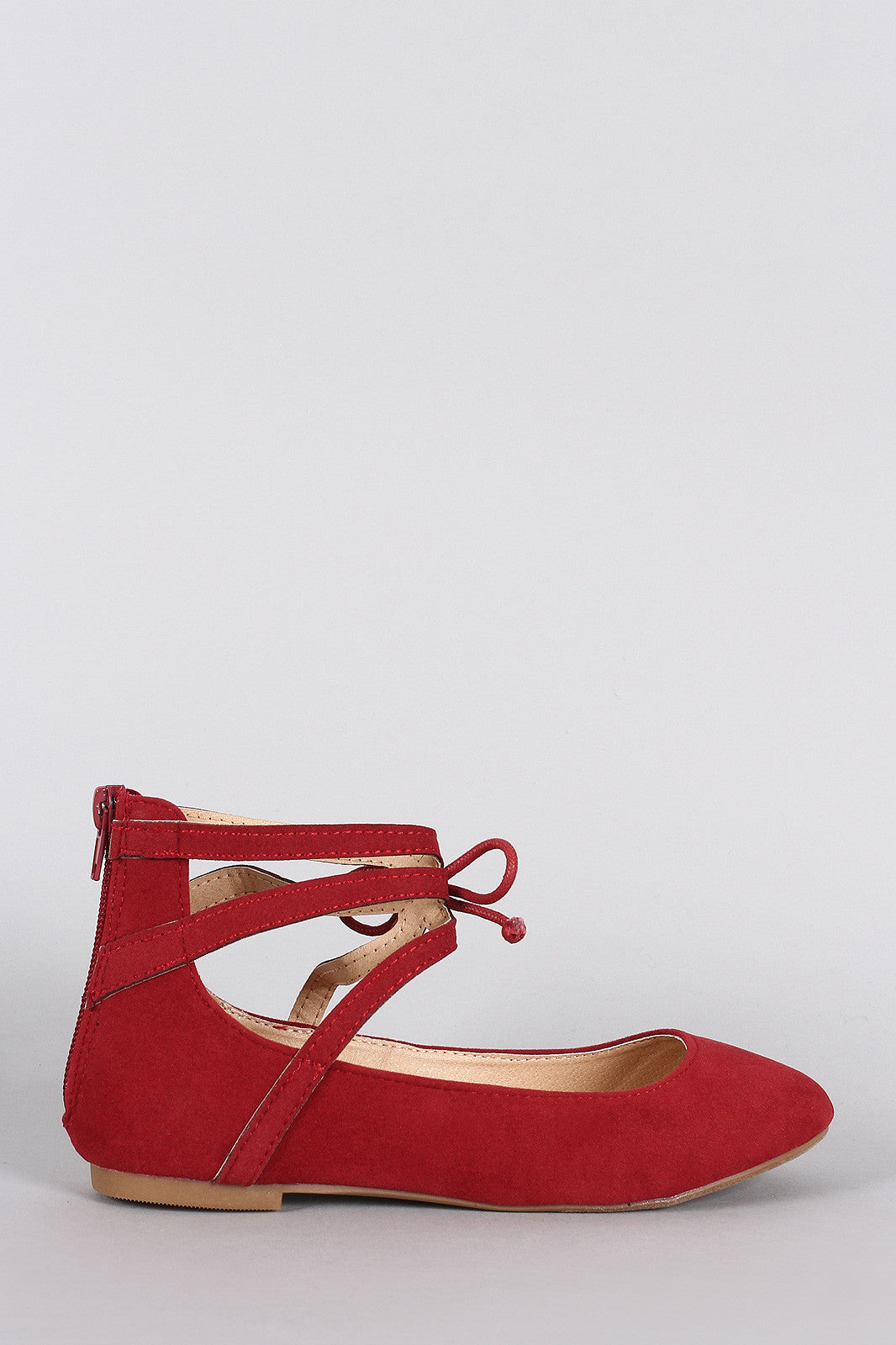 This gorgeous ballet flat features a round toe silhouette, strappy ankle cuff with bow tie accent, lightly padded insole, and rear zipper closure for easy on/off.Material: Vegan Suede (man-made)Sole: Rubber