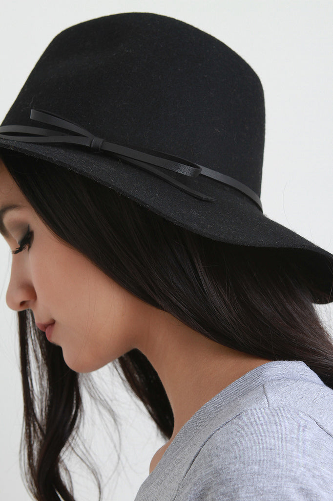 This soft felt fedora features a vented crown, floppy brim, and leatherette cord bow.