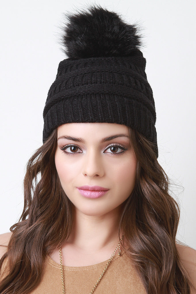 This beanie features a vertically and horizontally ridged design, elastic hem, and a large faux fur pom pom.