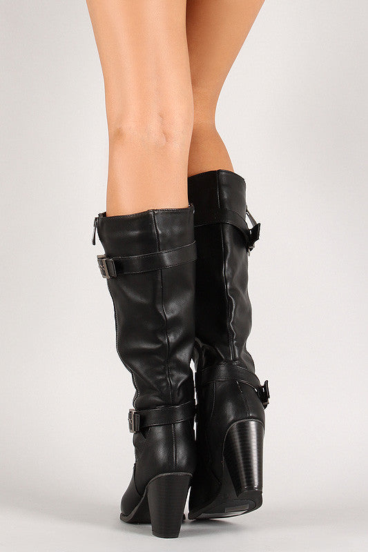 Featuring almond toe, side zipper decor, two adjustable buckle straps, stitching detail, full side zipper closure, chunky stacked heel, faux fur inner lining, and finished with lightly padded insole.Material: Vegan Leather (man-made)Sole: Treaded