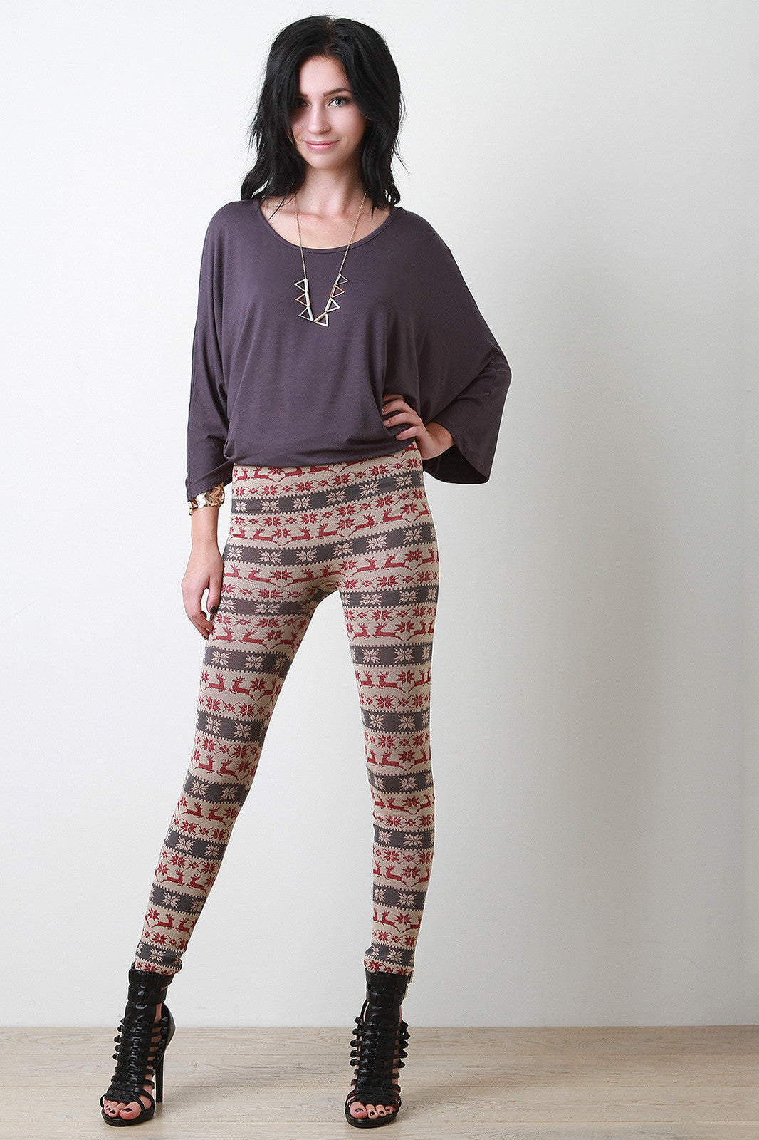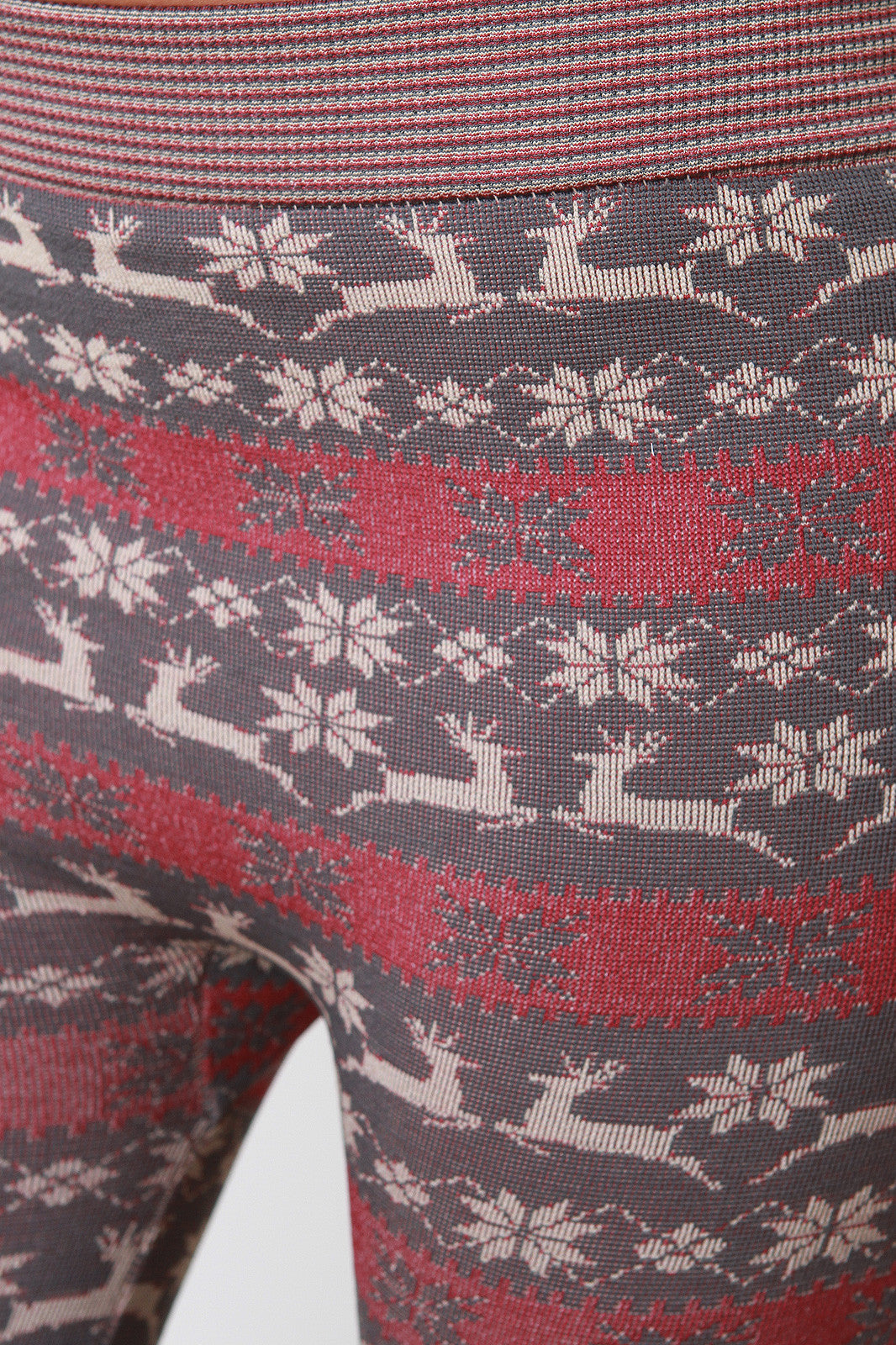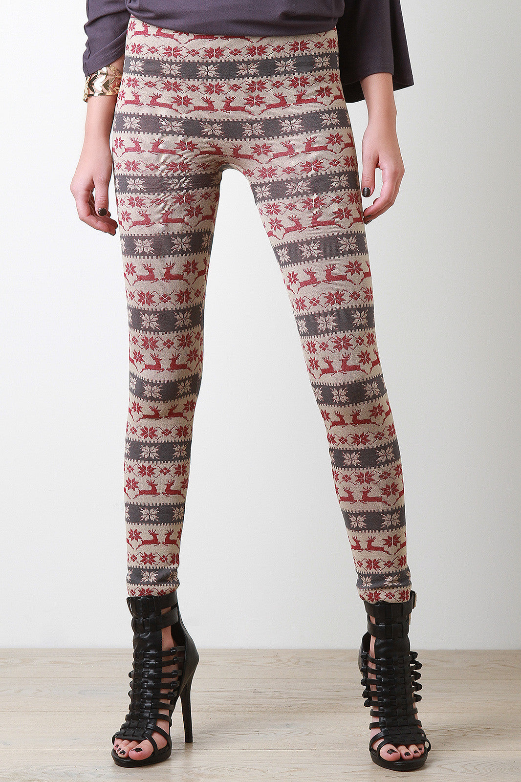 These leggings feature thick stretch knit, reindeer fair isle pattern throughout, striped elasticized waist, and taper cut. Accessories sold separately. 95% Polyester, 5% Spandex.
