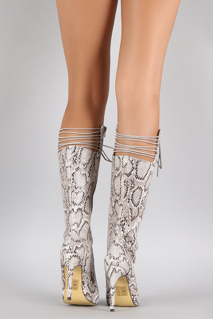 Python Strappy Pointy Toe Lace Up Stiletto Boots