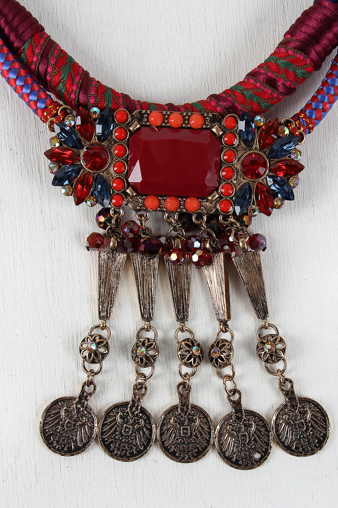 This necklace features strands of multicolor patterned rope tied together, a jeweled-encrusted centerpiece, and hanging iridescent beads and coin charms. Finished with an adjustable lobster hook closure and includes matching earrings.