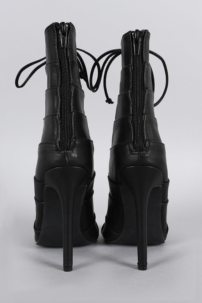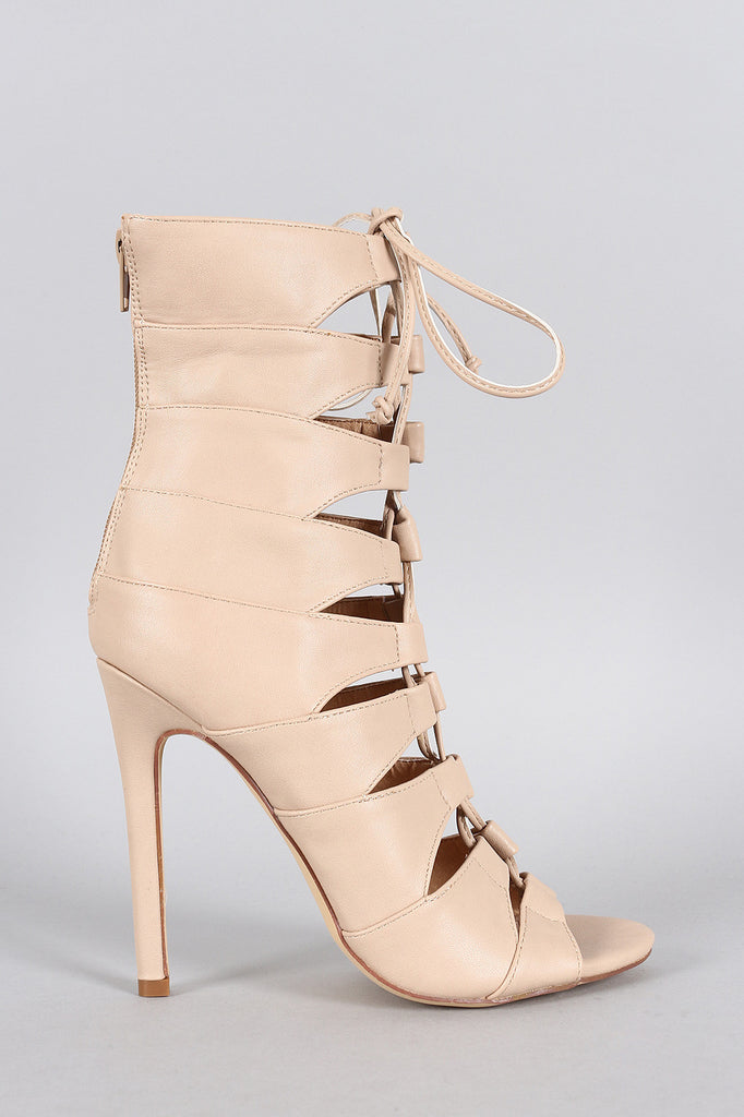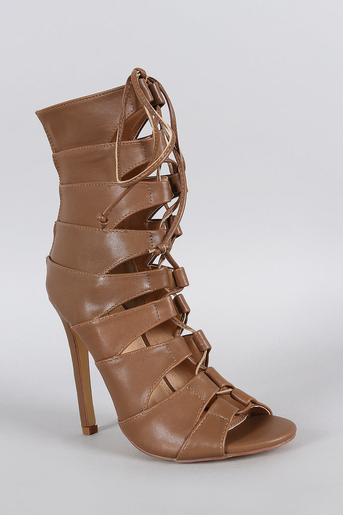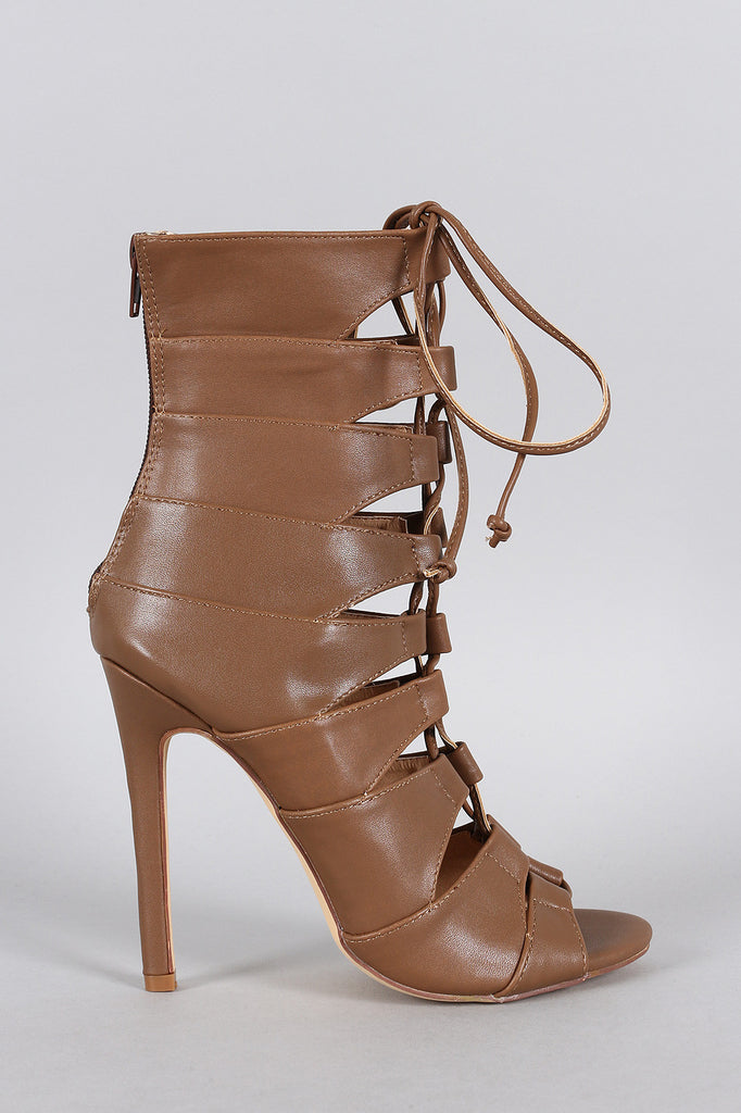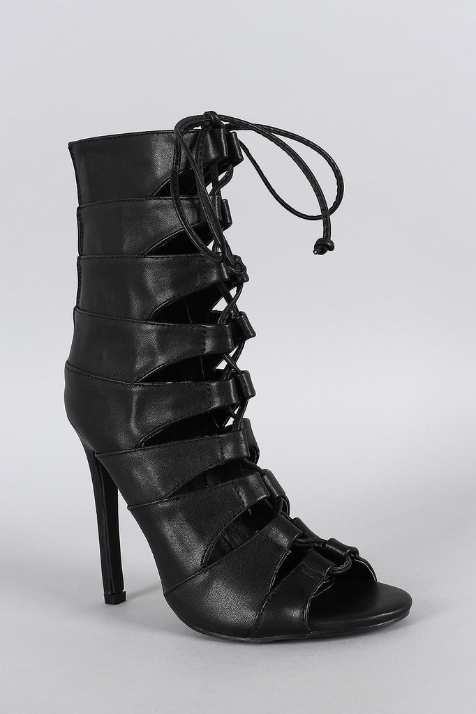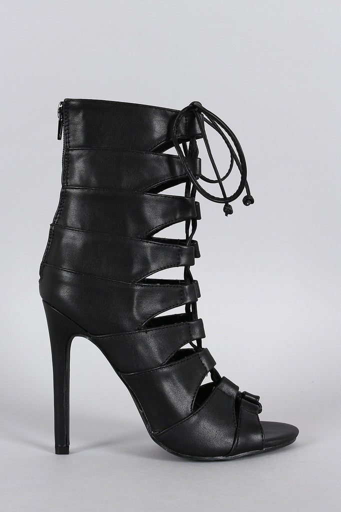 This striking heel features a peep toe, cage-like silhouette, lacing detail at front, and wrapped stiletto heel. Finished with lightly padded insole and rear zipper closure for easy on/off.Material: Vegan Leather (man-made)Sole: Synthetic
