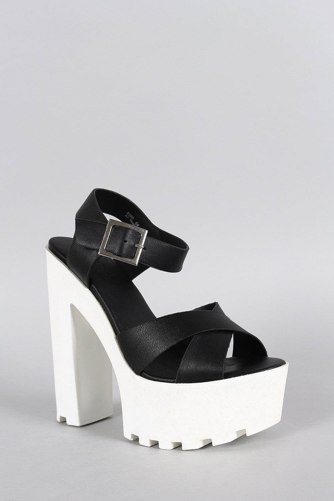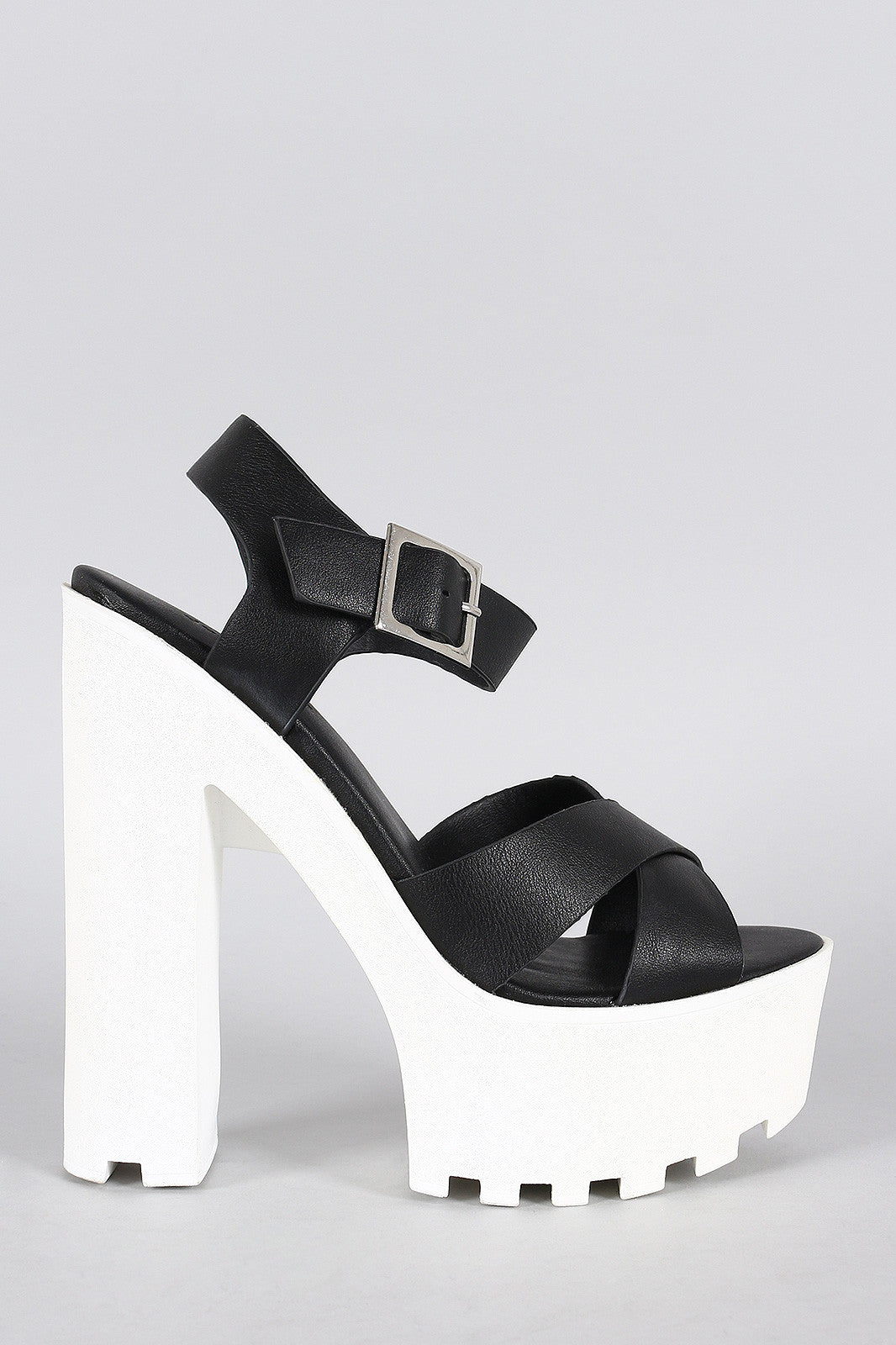 This heel features a leg lifting lug sole . Features a slingback strap that forms into an adjustable ankle strap. Finished with two crossing straps on the upper vamp.
