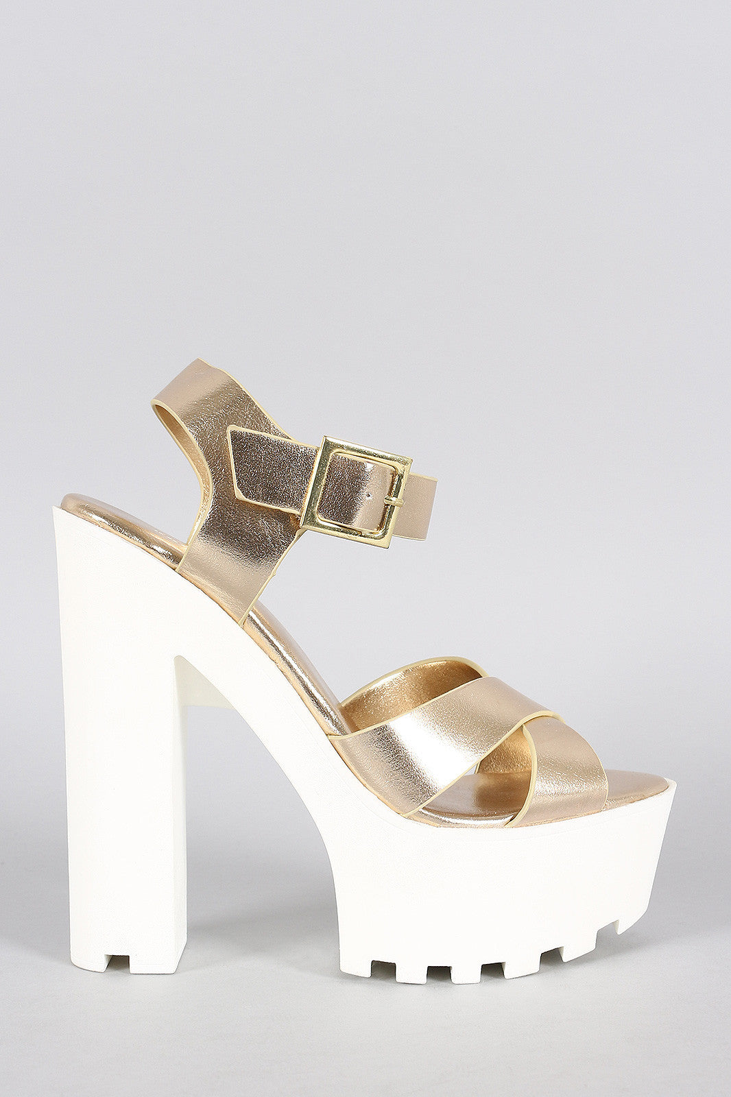This metallic heel features a leg lifting lug sole . Features a slingback strap that forms into an adjustable ankle strap. Finished with two crossing straps on the upper vamp.