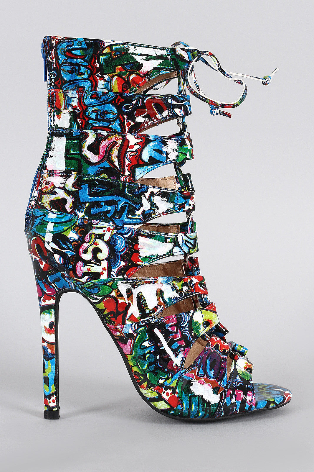 This corseting laces with an adjustable rear back zipper. Graffiti print design throughout.