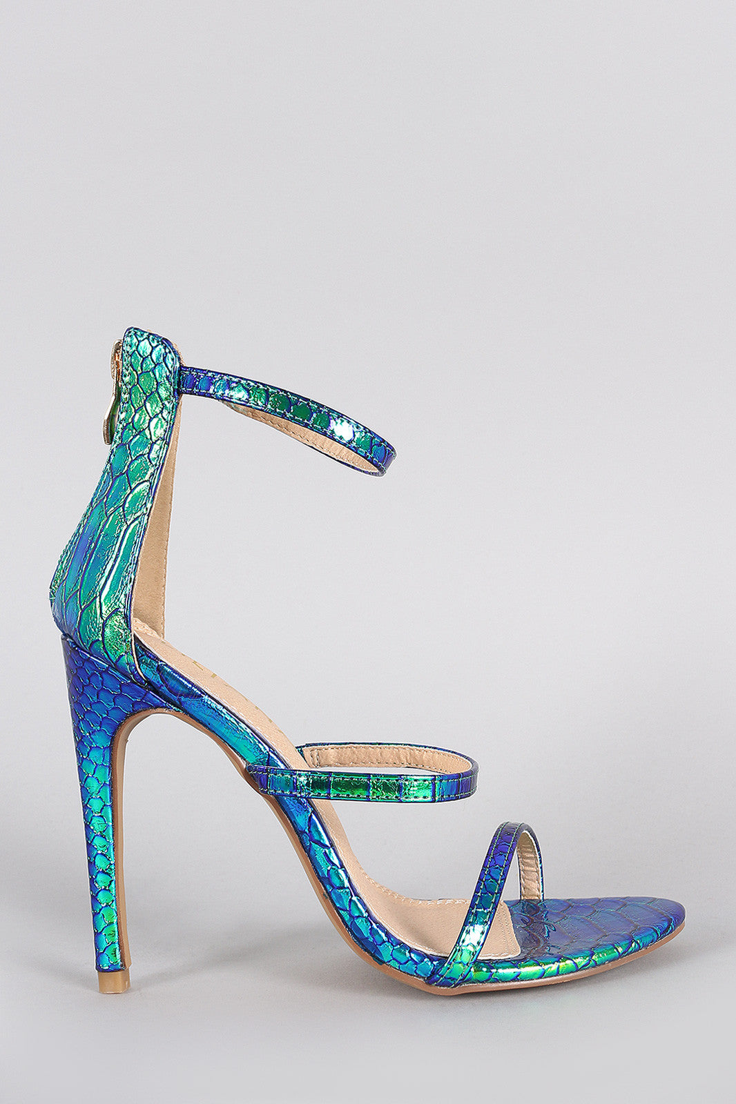 This fabulous snake embossed hologram vegan leather upper, open toe silhouette, triple skinny straps, and wrapped stiletto heel. Finished with lightly cushioned insole and rear zipper closure for easy on/off.Material: Hologram Vegan Leather (man-made)Sole: Synthetic
