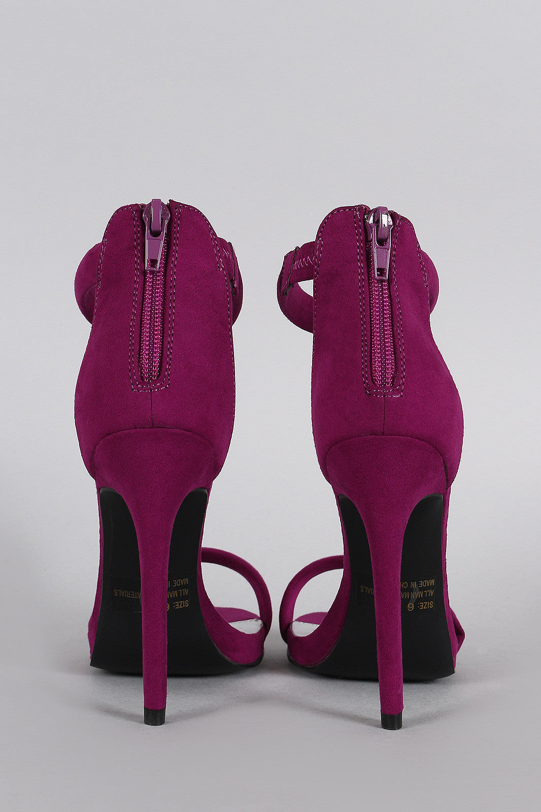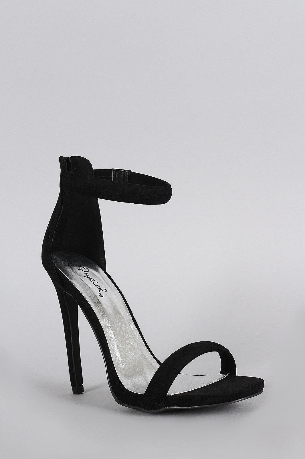 This is a classic open toe heel ; featuring a single strap vamp and an ankle strap. Rear back adjustable zipper closure. Finished on a stiletto heel.