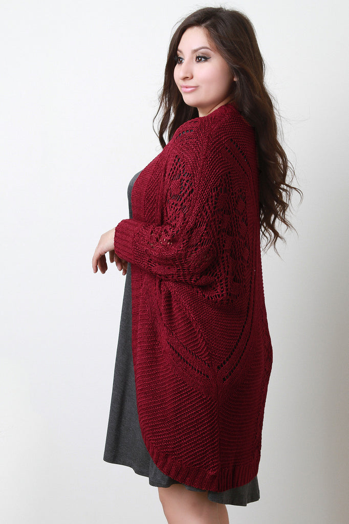 A plus size longline cardigan featuring loose crochet, ribbed hems, rounded open front, and full-length dolman sleeves. Accessories sold separately. 70% Acrylic, 30% Polyester.