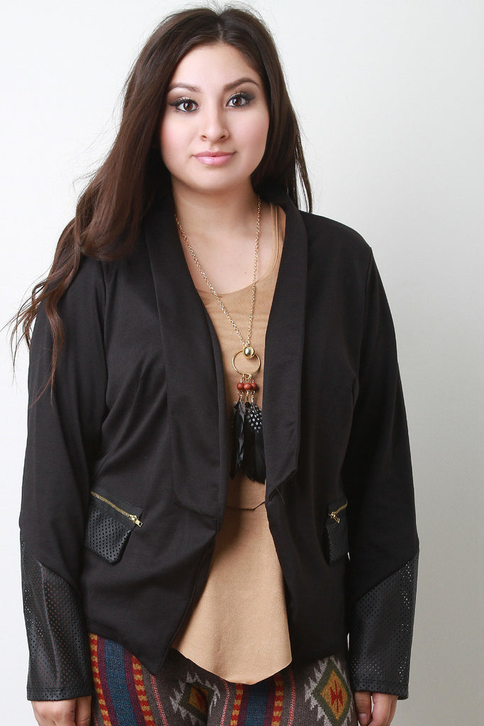 This plus size blazer features an open front collar neckline, long sleeves with perforated vegan leather trims, and faux zipper pockets at front. Accessories sold separately. Made in U.S.A. Self: 80% Polyester, 15% Rayon, 5% Spandex. Contrast: 100% Polyester.