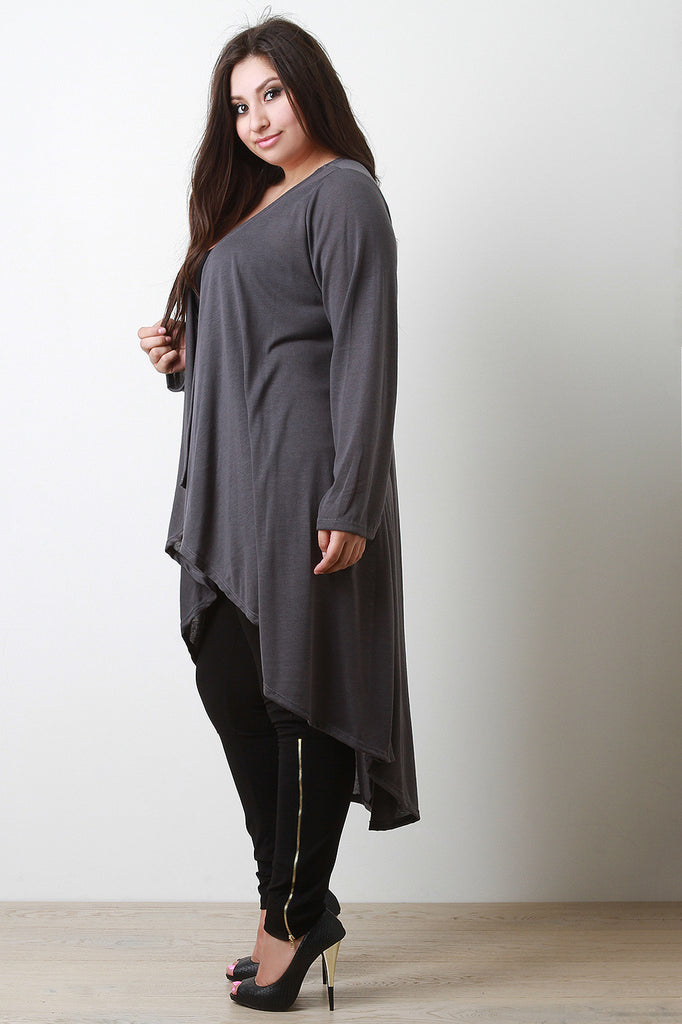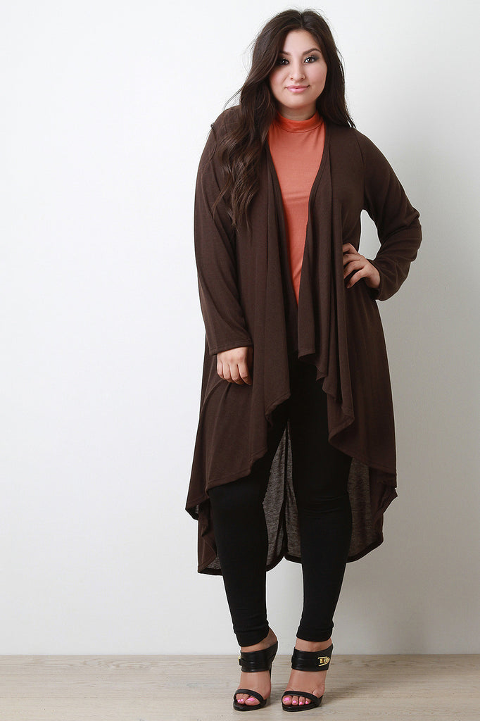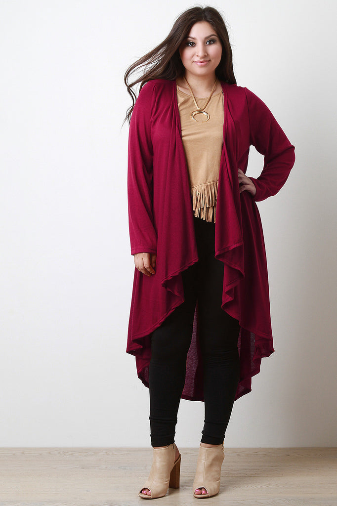 This longline plus size cardigan features a stretchy knit fabrication, open front with drape detail, long sleeves design, and finished with asymmetrical curved hemline. Accessories sold separately. Made in U.S.A. 87% Polyester, 10% Rayon, 3% Spandex.