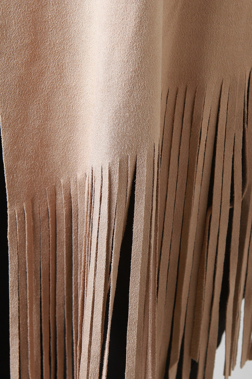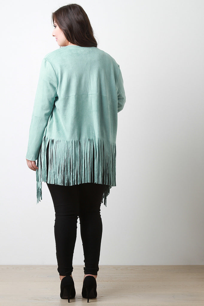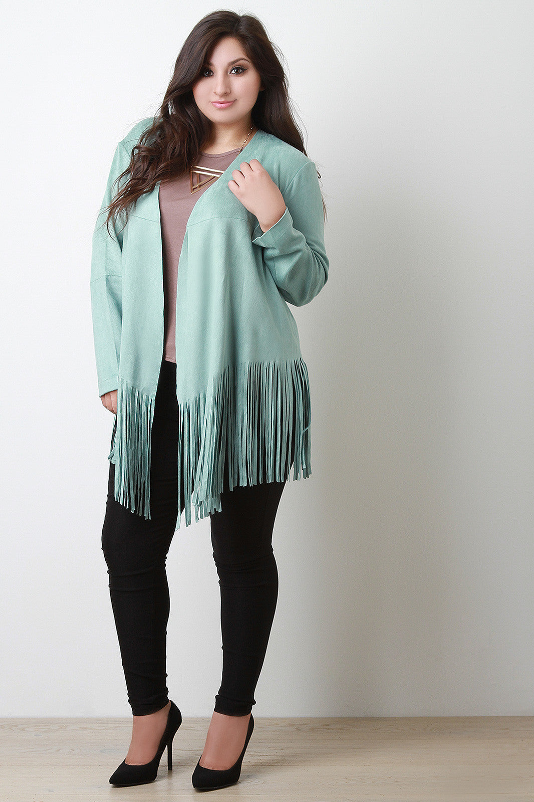 This plus size coat features a patchwork vegan suede fabrication, open front construction, long sleeves, and fringe hemline. Accessories sold separately. 95% Polyester, 8% Spandex.