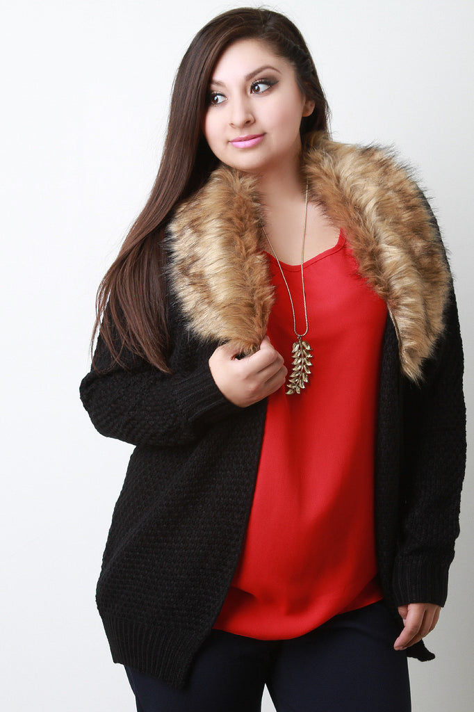 This cardigan features a thick, knitted fabrication pattern with faux fur around the collar and the accents of the sweater along with a thigh length. Accessories sold separately. 100% Acrylic.