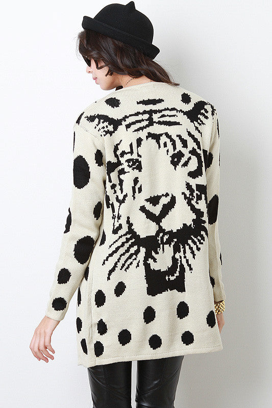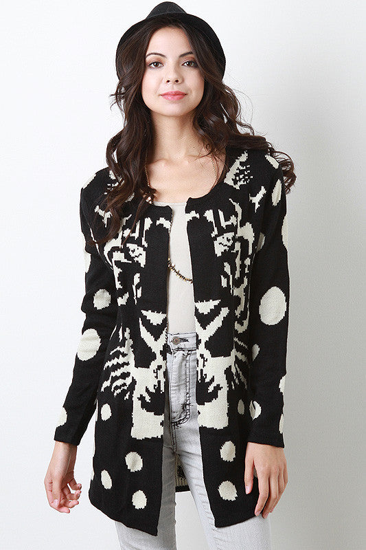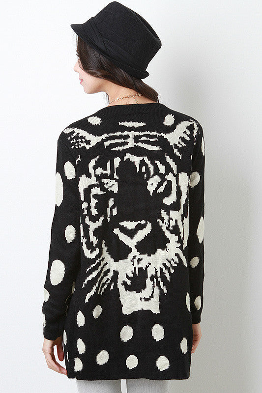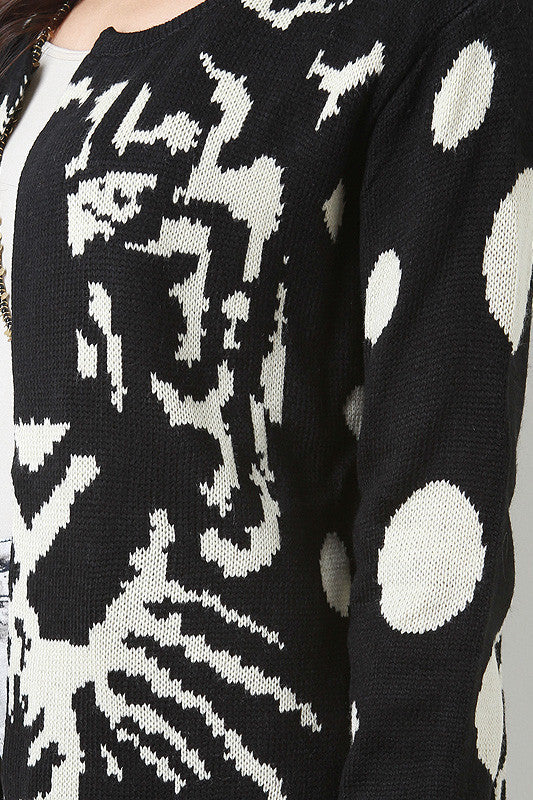 Bust out your unique fall style with the Spotilicious Cardigan. Featuring a woven knit construction, animal print throughout, full length sleeves, and open front. Accessories sold separately. 35% Polyester, 65% Acrylic.