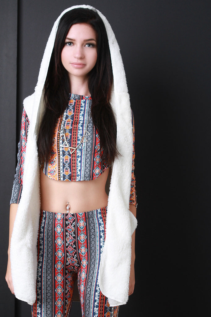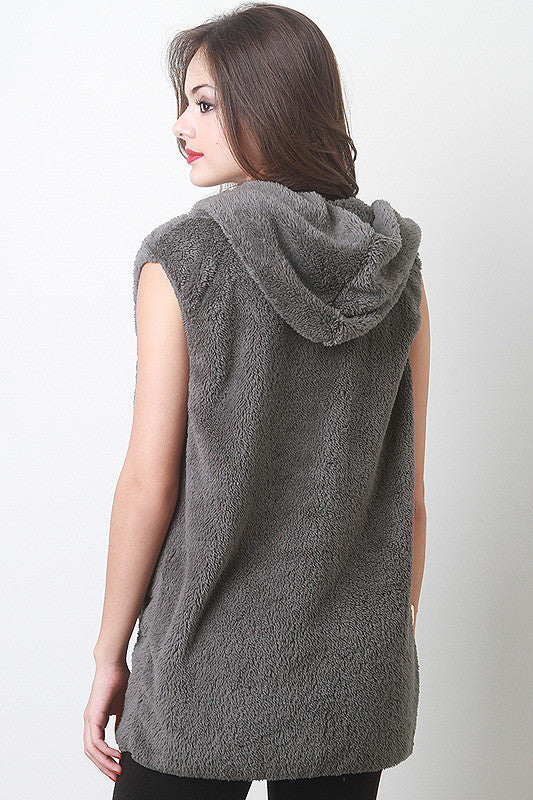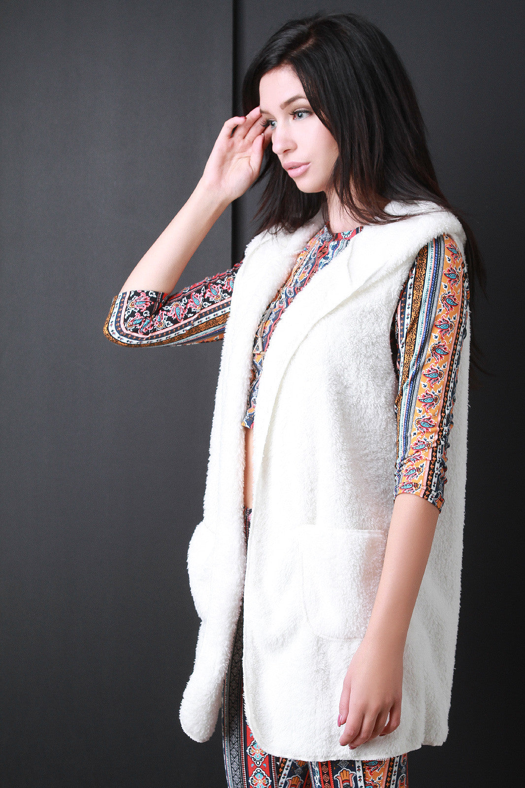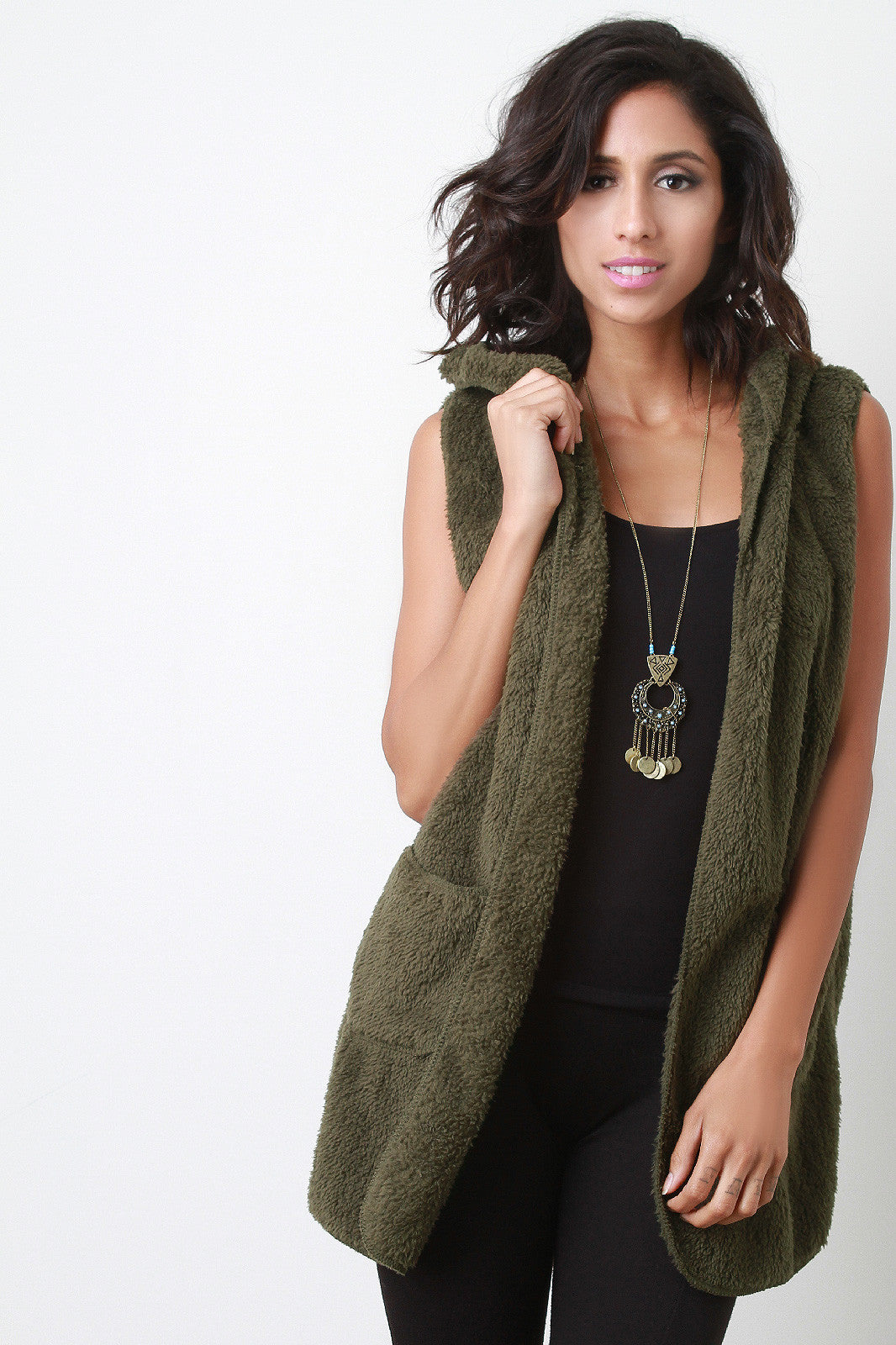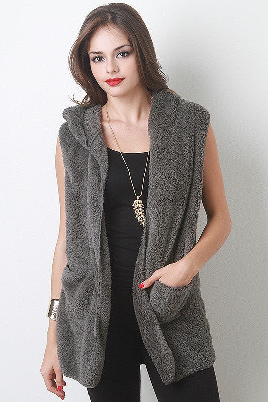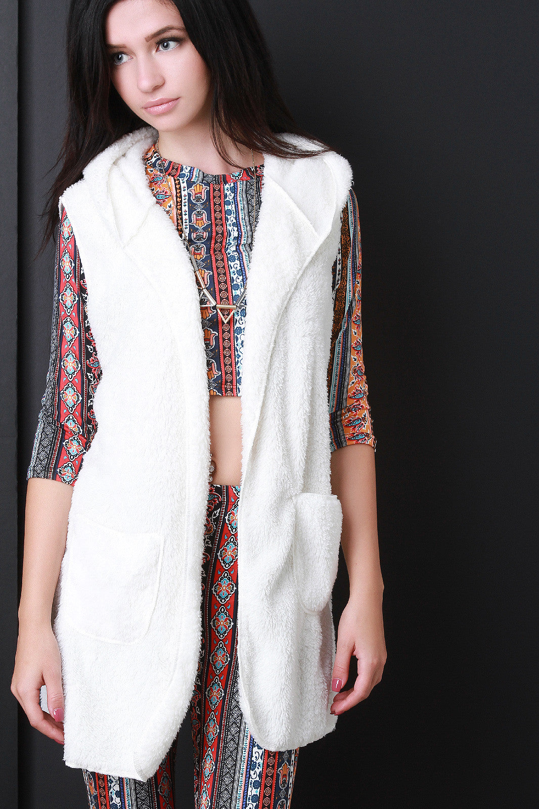 Featuring a fuzzy knit fabric, open pockets, hooded detail, and open front. Accessories sold separately. 100% Polyester.