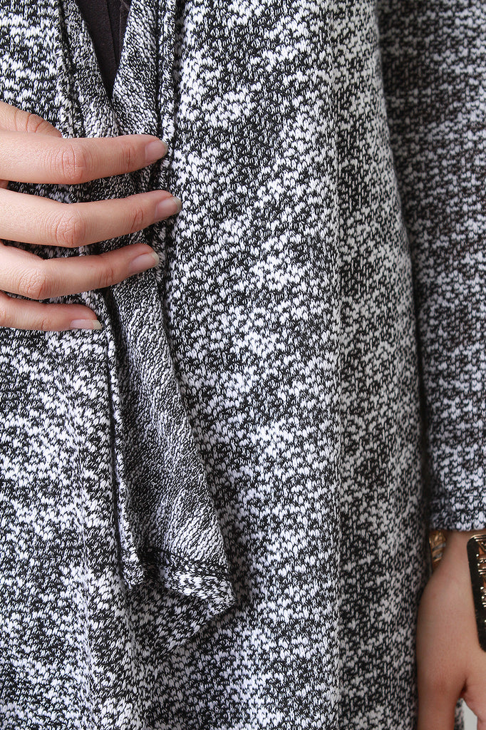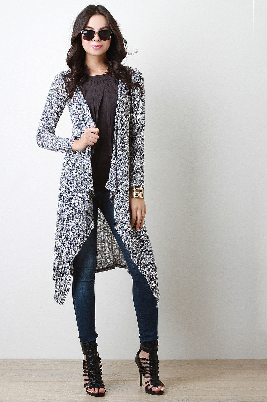 This two-tone marled knit cardigan features an open waterfall front, long sleeves, and a longline design. Accessories sold separately. 65% Cotton, 35% Pagester.