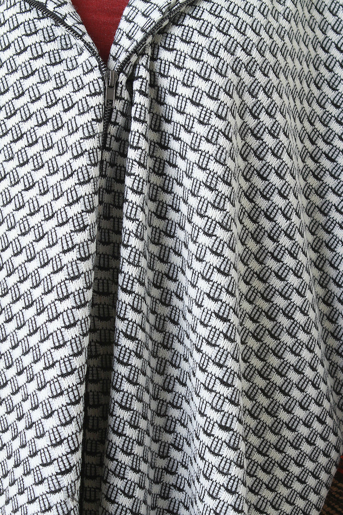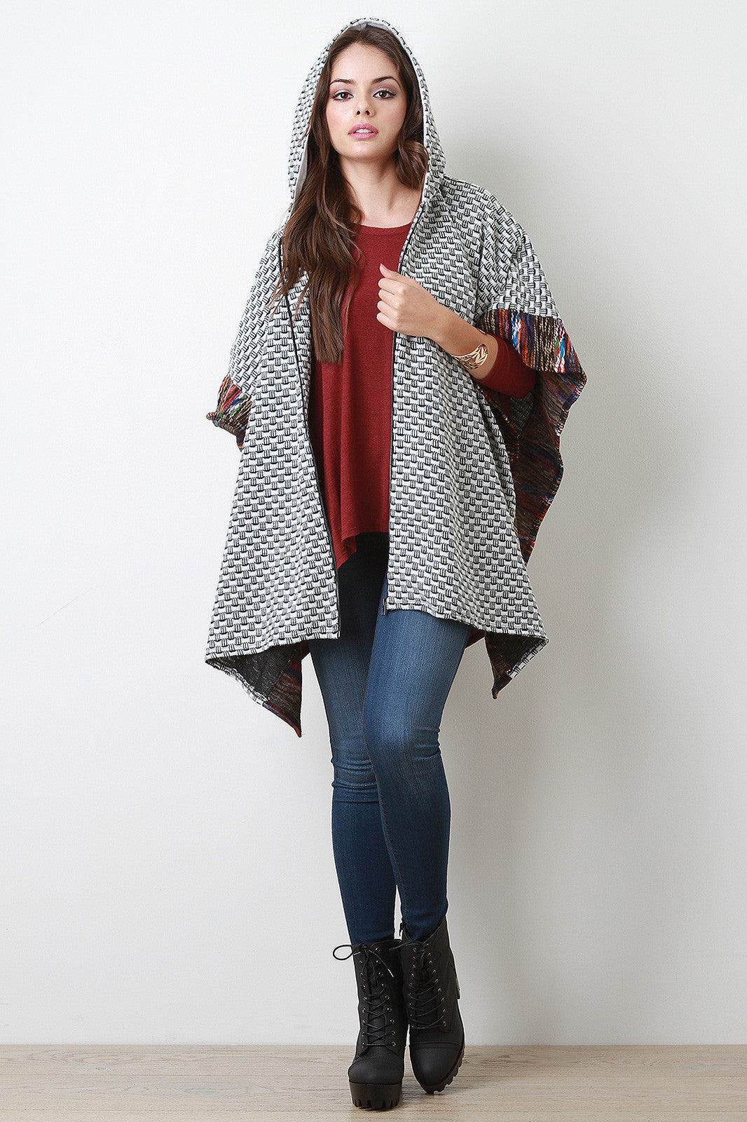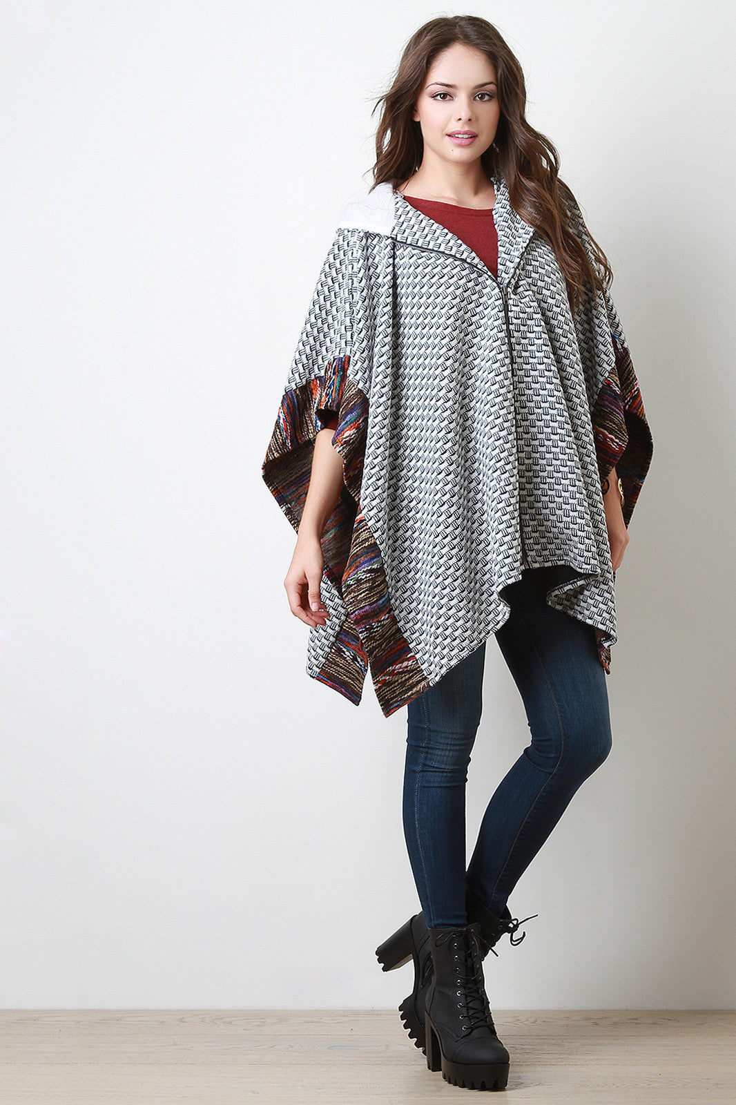 This oversized woven cape features a square textured fabrication with contrasting woven panels, attached hoodie, bottom arm openings, asymmetrical hem, and front zipper closure. Accessories sold separately. Self: 60% Acrylic, 40% Polyester. Contrast: 50% Acrylic, 50% Polyester.
