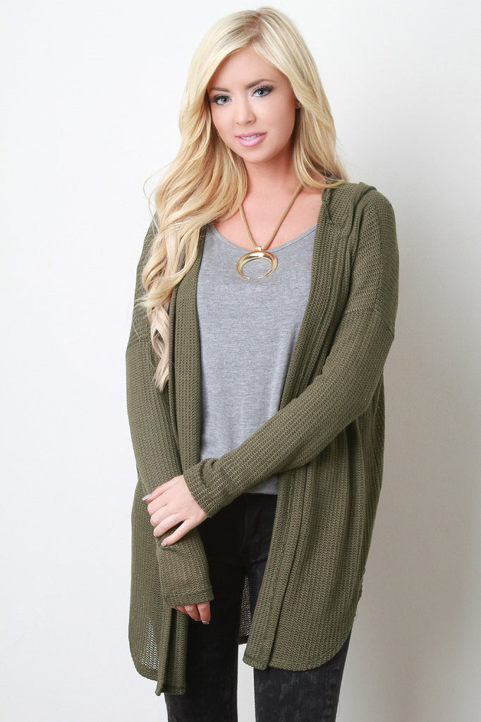 This cardigan features a hoodie back, open front, loosely knitted construction, and long sleeves. Accessories sold separately. Made in U.S.A. 64% Polyester, 34% Rayon, 2% Spandex.