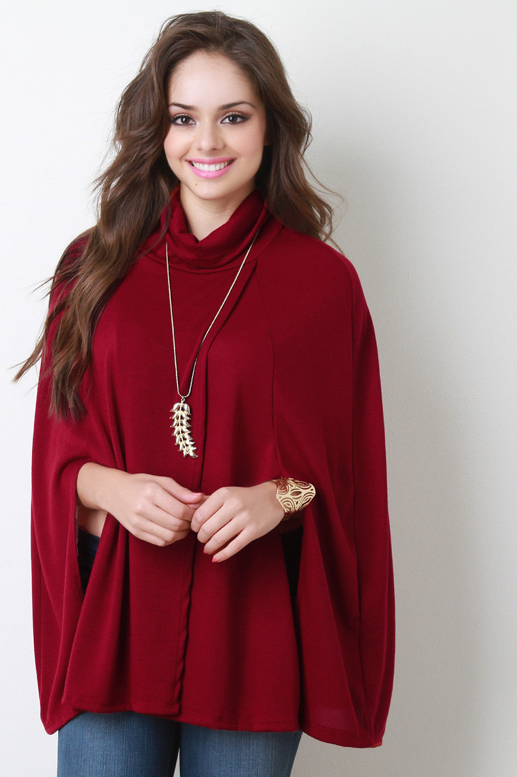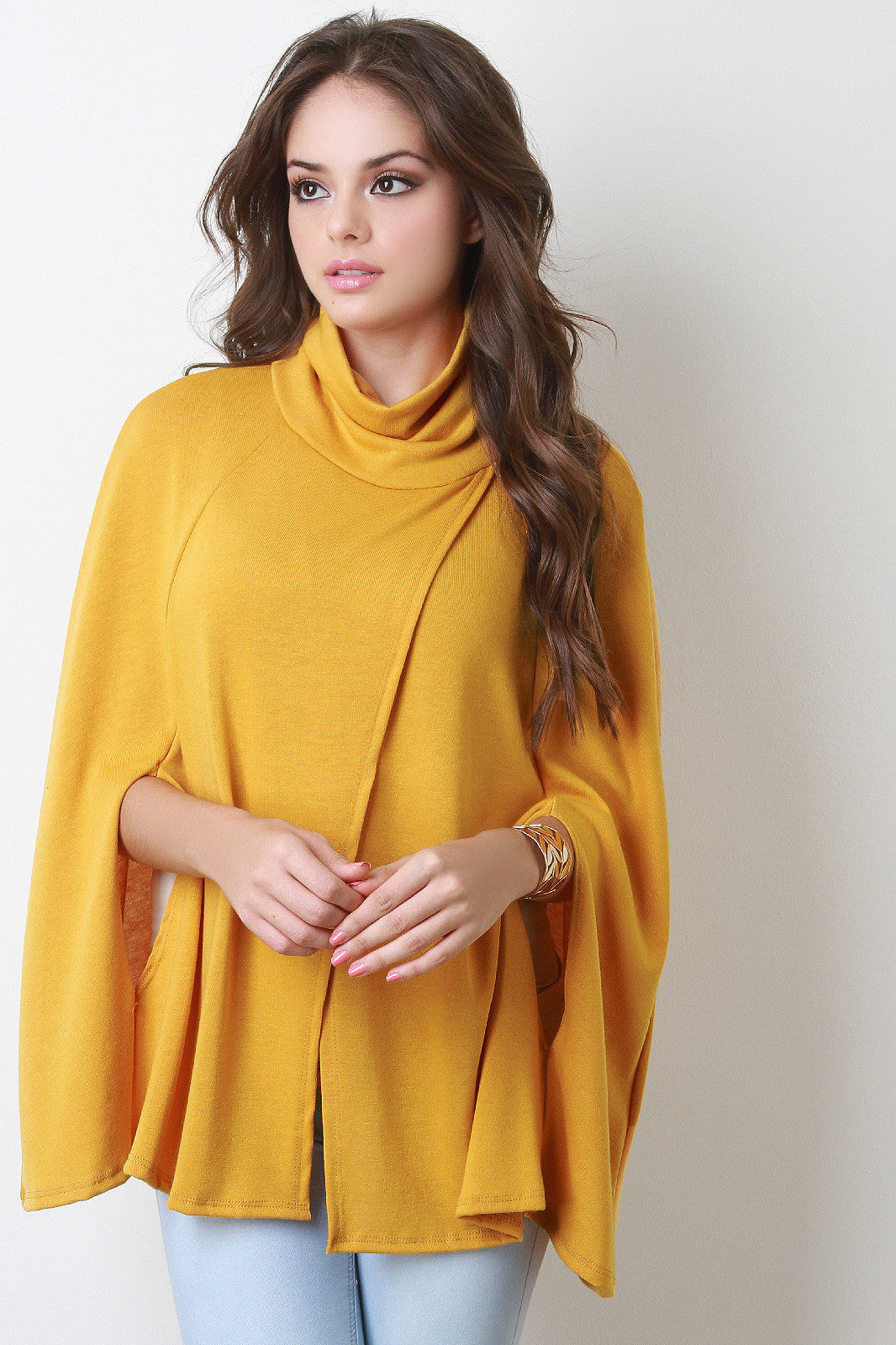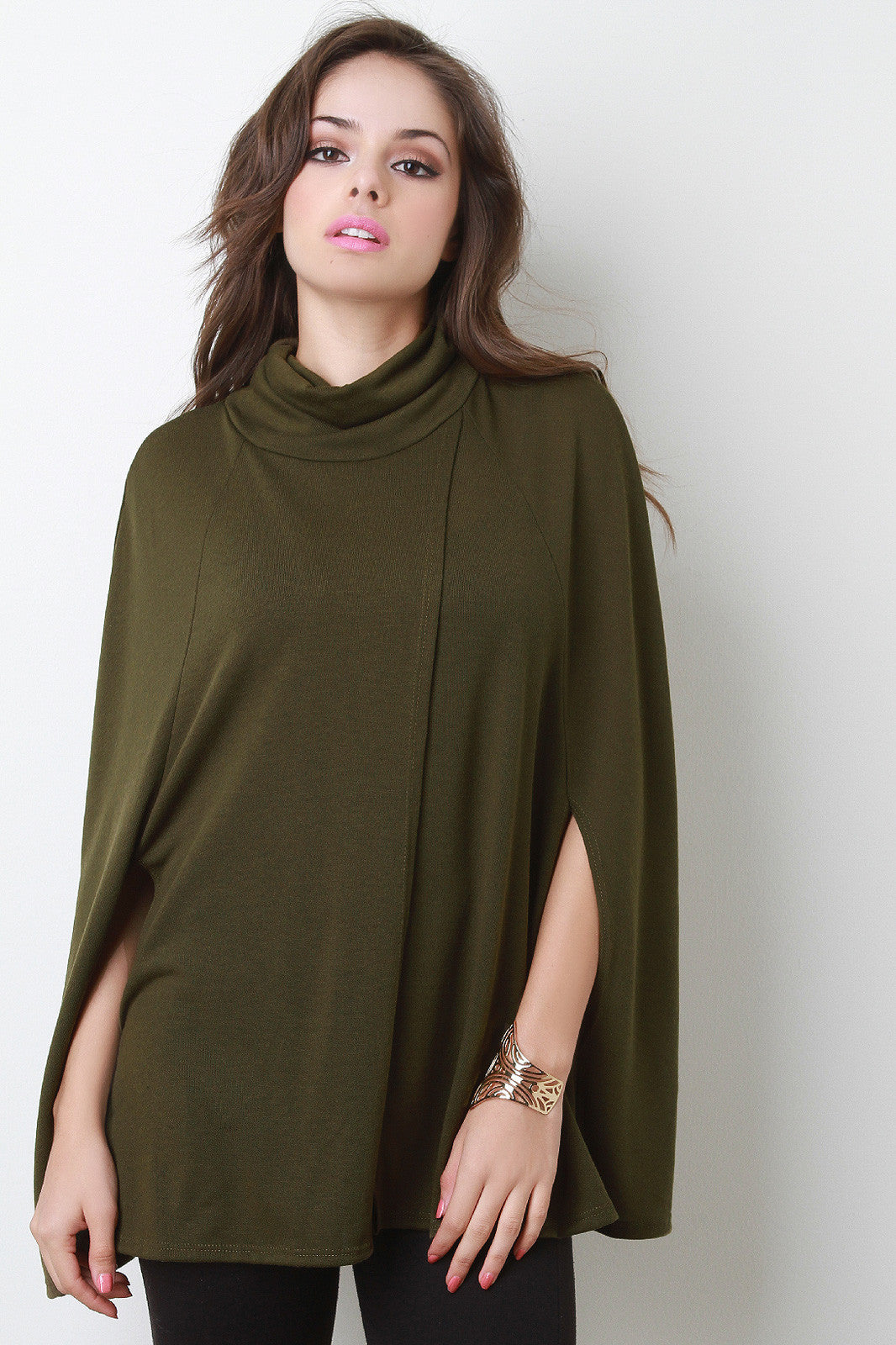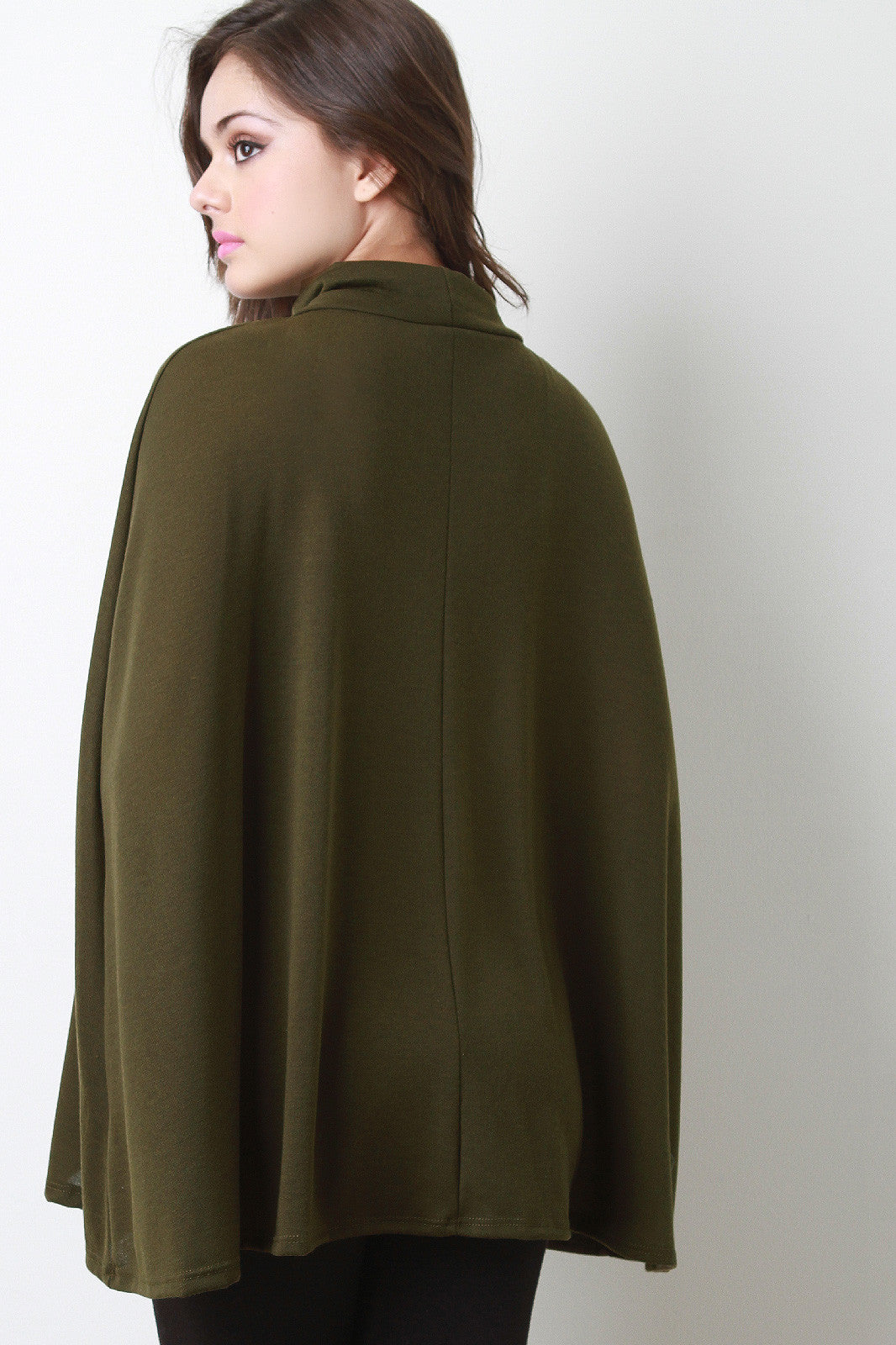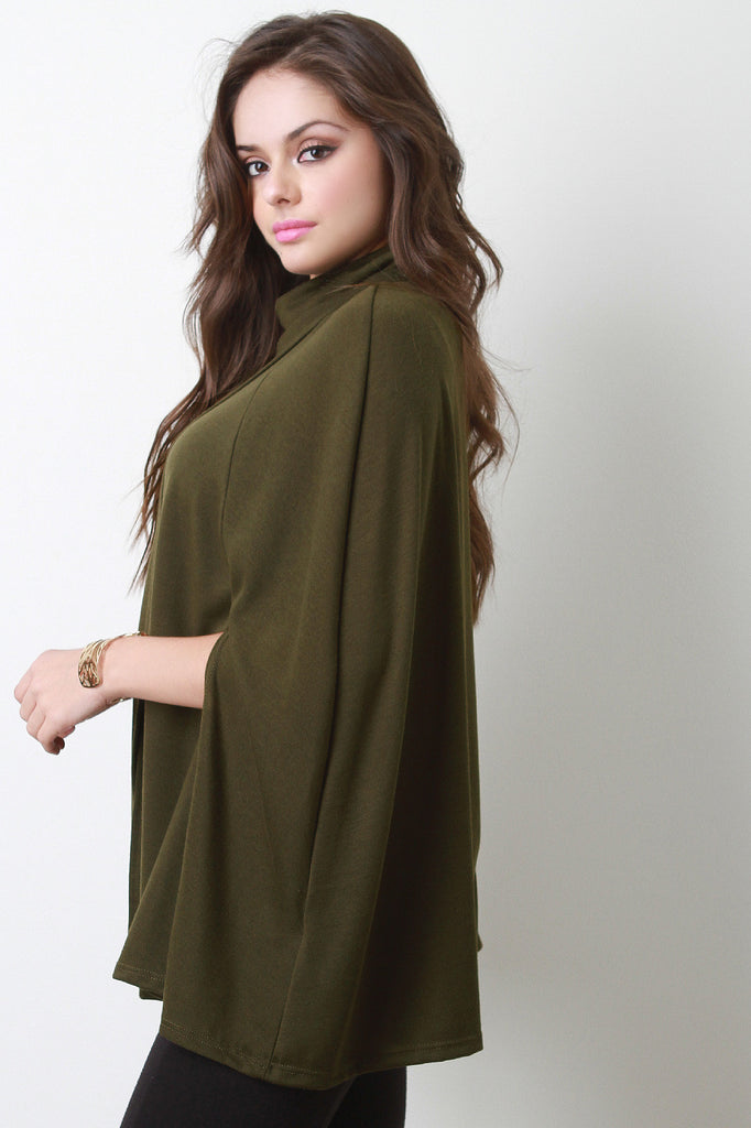 This trendy cape features a turtleneck, overlapping detail at front, and cape design arm openings. Unlined. Accessories sold separately. Made in U.S.A. 95% Polyester, 5% Spandex.