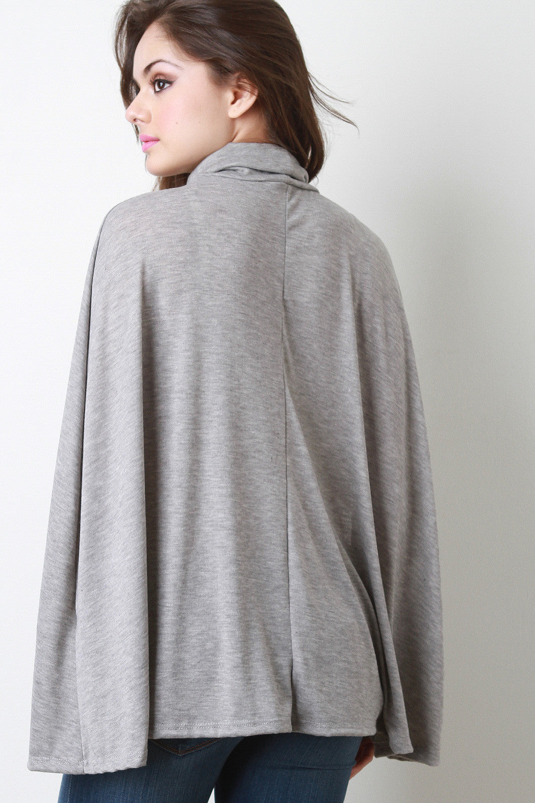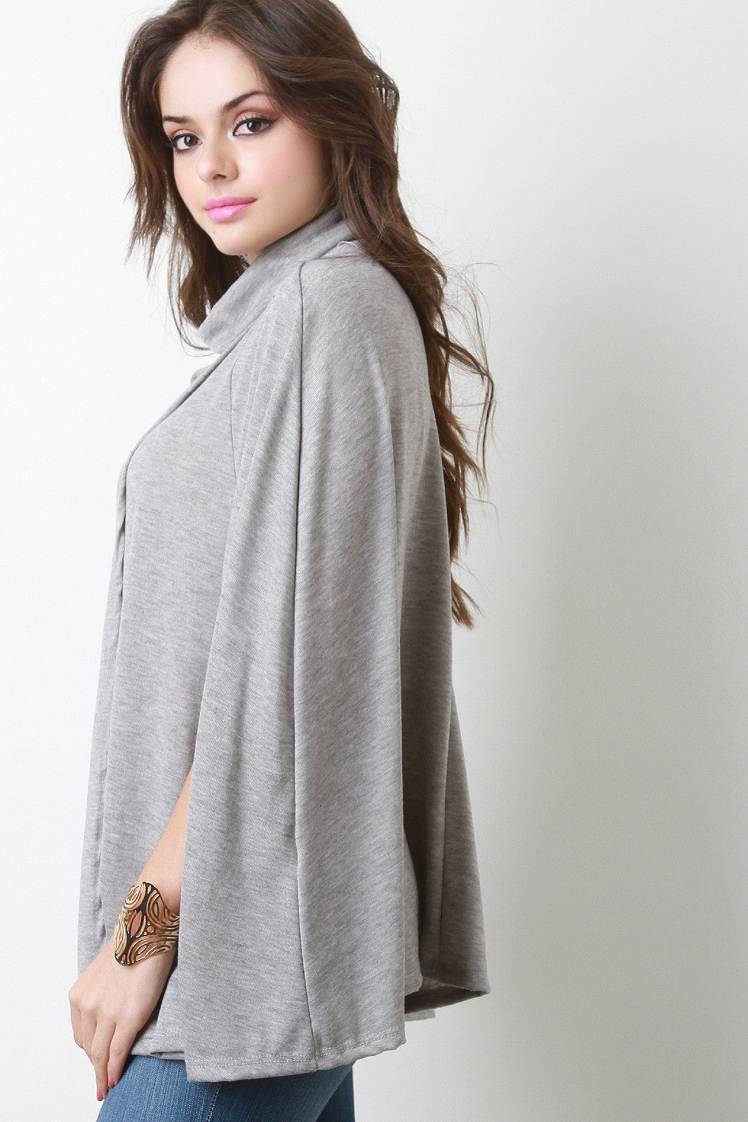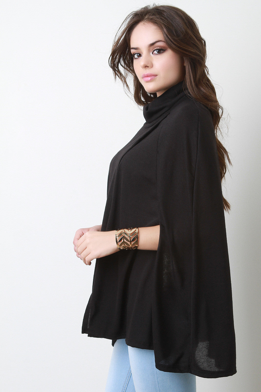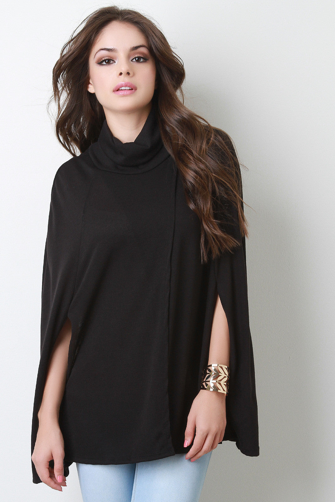 This trendy cape features a turtleneck, overlapping detail at front, and cape design arm openings. Unlined. Accessories sold separately. Made in U.S.A. 95% Polyester, 5% Spandex.