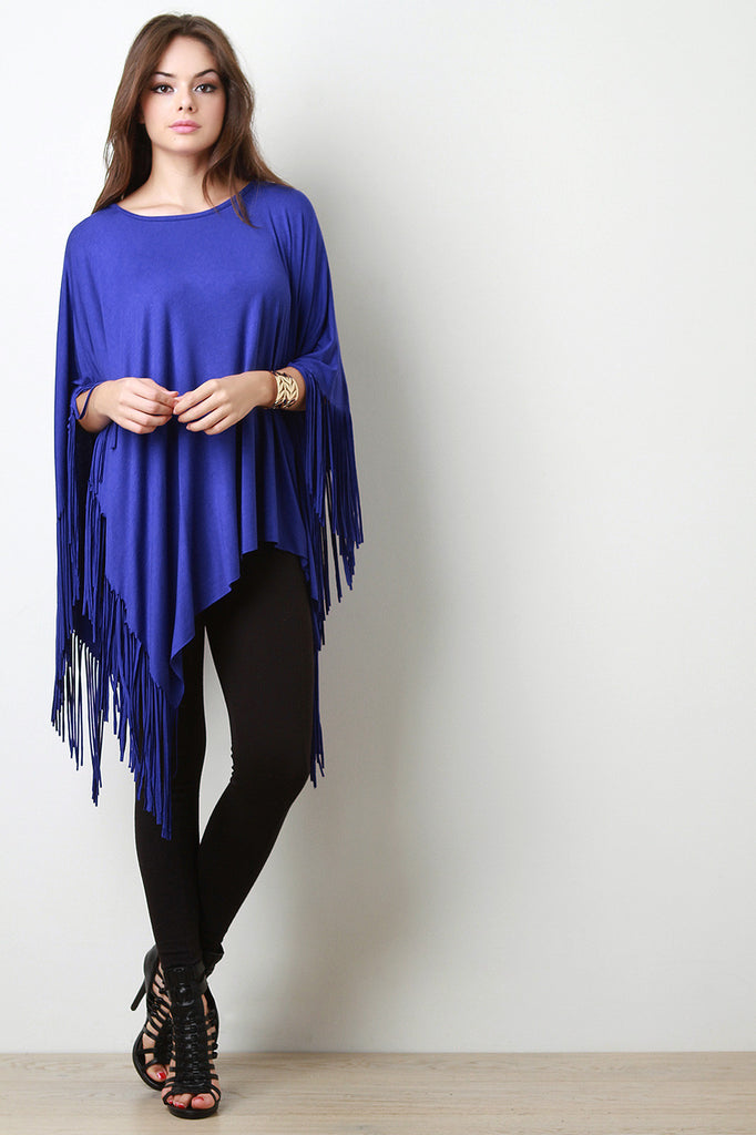 Jersey Knit Fringe Handkerchief Hem Poncho
