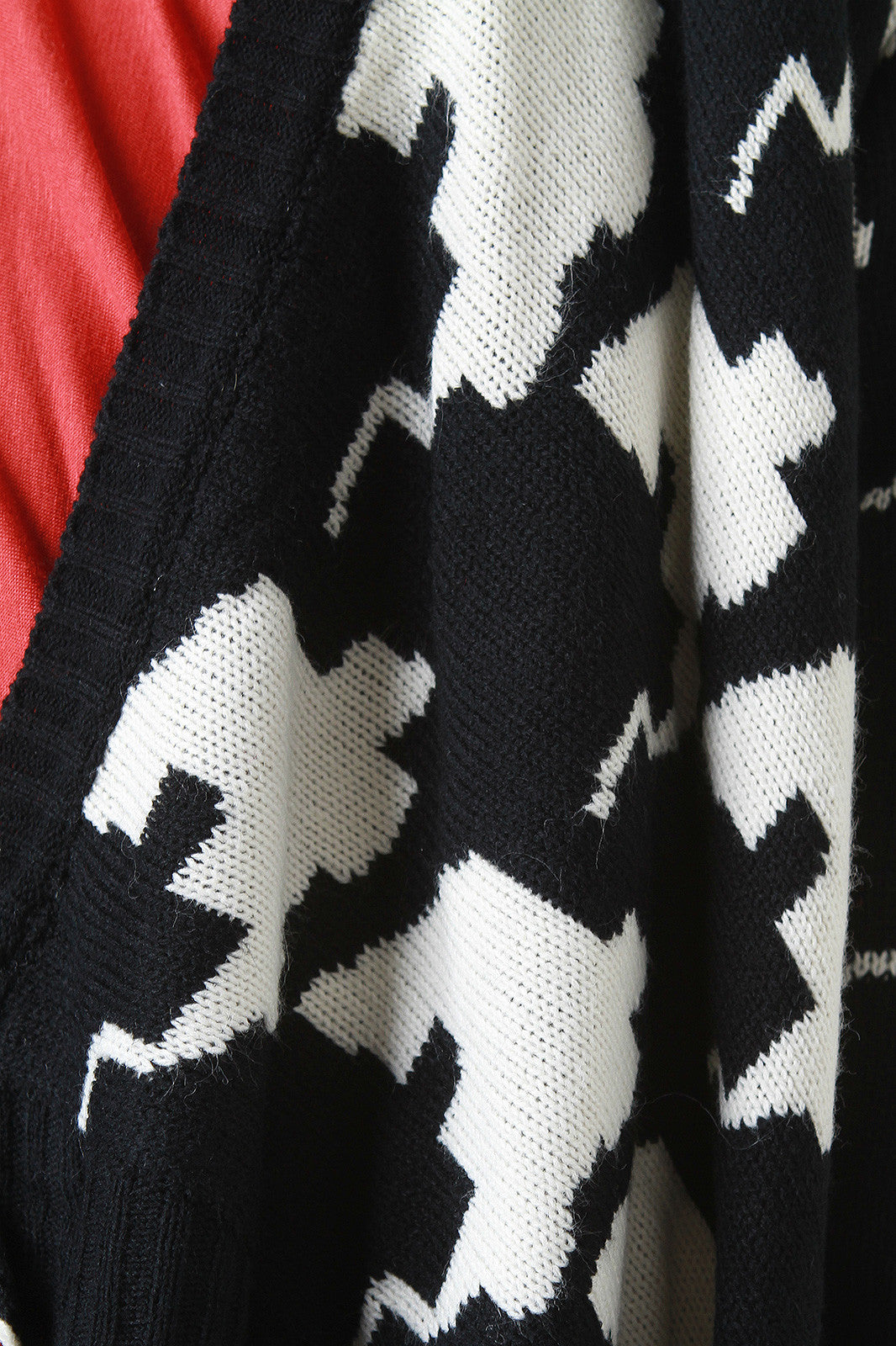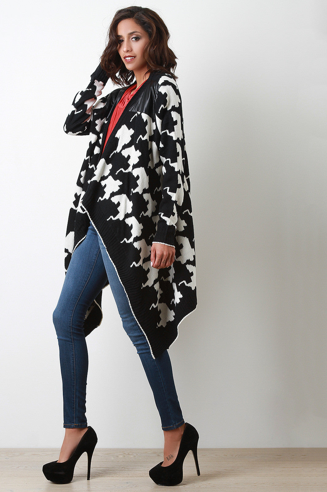 This cardigan features large contrasting houndstooth knit pattern, vegan leather shoulder patch, an open front, and an asymmetrical hemline. Accessories sold separately. 65% Acrylic, 35% Polyester.
