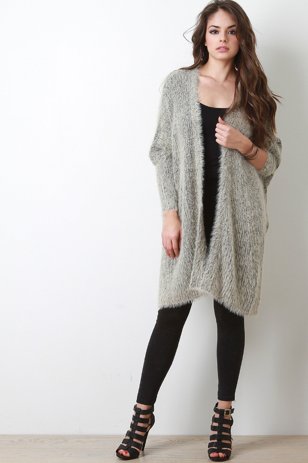 This longline cardigan features marled knit with fuzzy texture, open front, long dolman sleeves, and side vent slits. Accessories sold separately. 60% Cotton, 40% Acrylic.