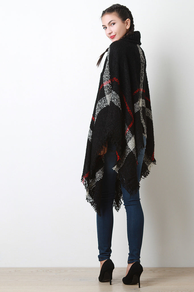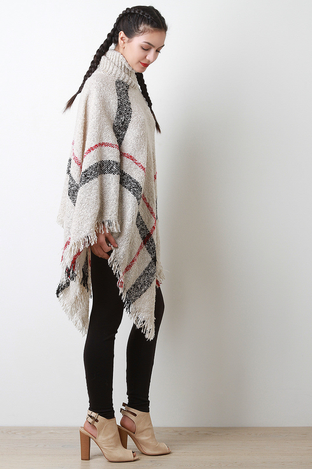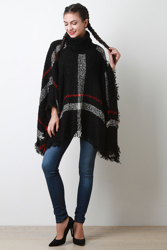 This poncho features soft textured knit, two-tone linear pattern, turtlneck, open sides, and fringed asymmetrical hemline. Accessories sold separately. 100% Acrylic.