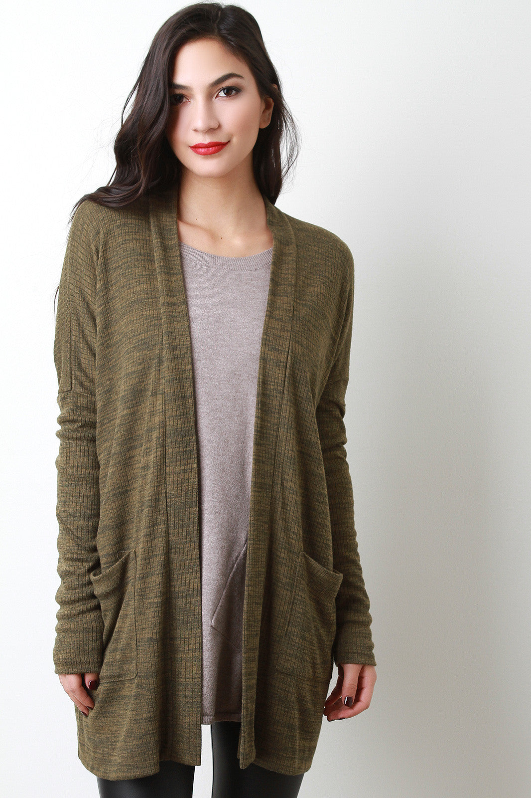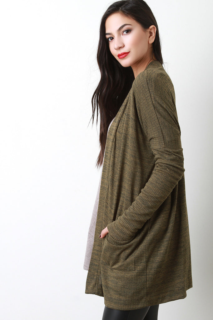 This cardigan features a two-tone ribbed knit fabrication, open front, long sleeves, and square front pockets. Accessories sold separately. Made in U.S.A. 70% Polyester, 25% Rayon, 5% Spandex.