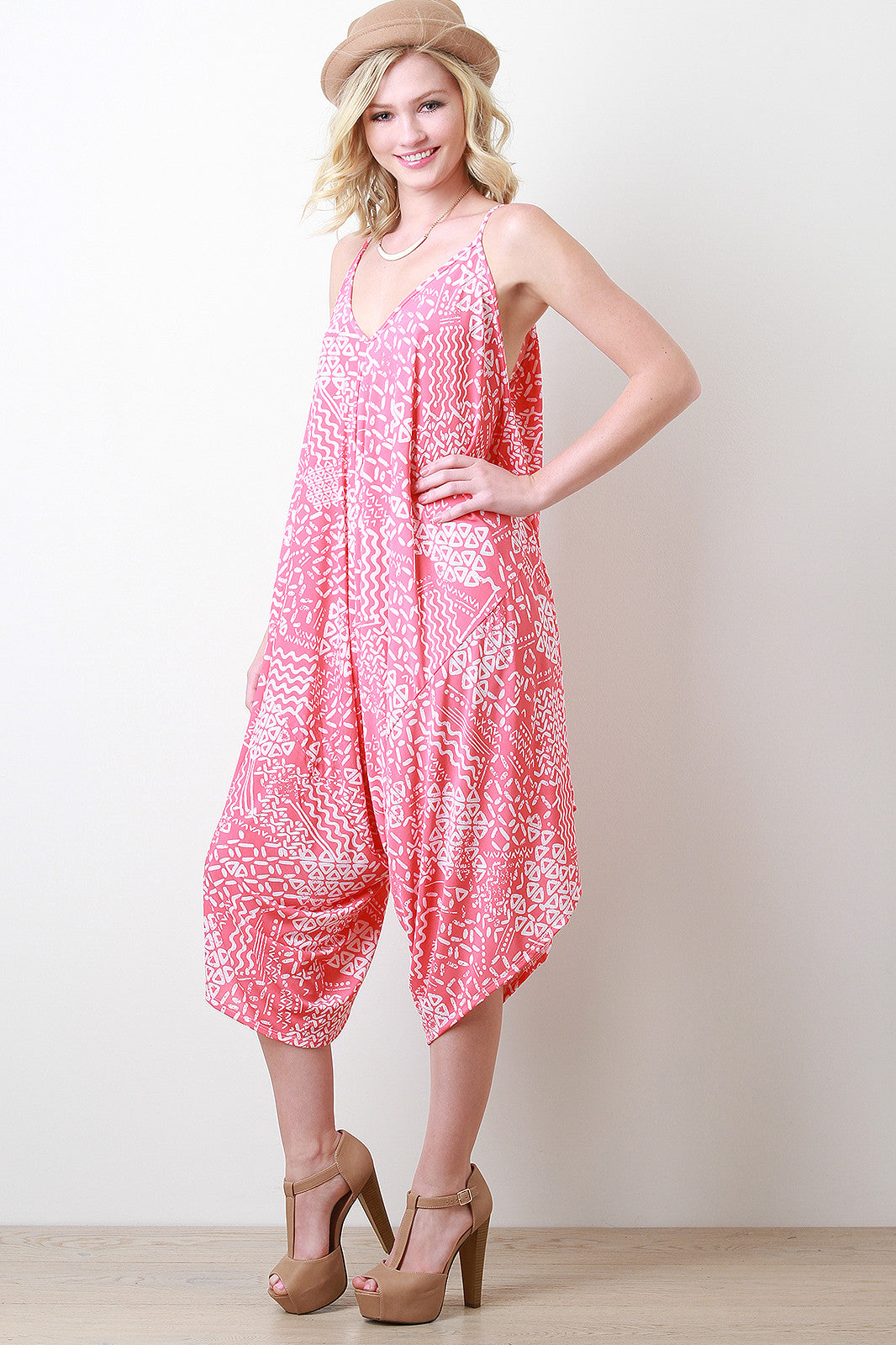 This jumpsuit features symbol pattern print design, sleeveless, v-neckline, and harem cut bottom half. Accessories sold separately. Made in U.S.A. 100% Polyester.