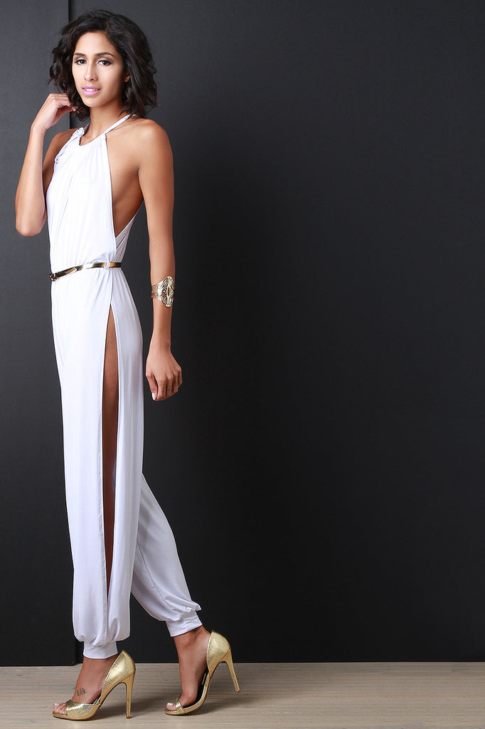 This harem inspired jumpsuit features plunging arm holes and high side slits. Designed with a self-tie halter neckline and cuffed hems. Unlined. Includes gold metallic belt. Other accessories sold separately. Made in U.S.A. 96% Polyester. 4% Spandex.