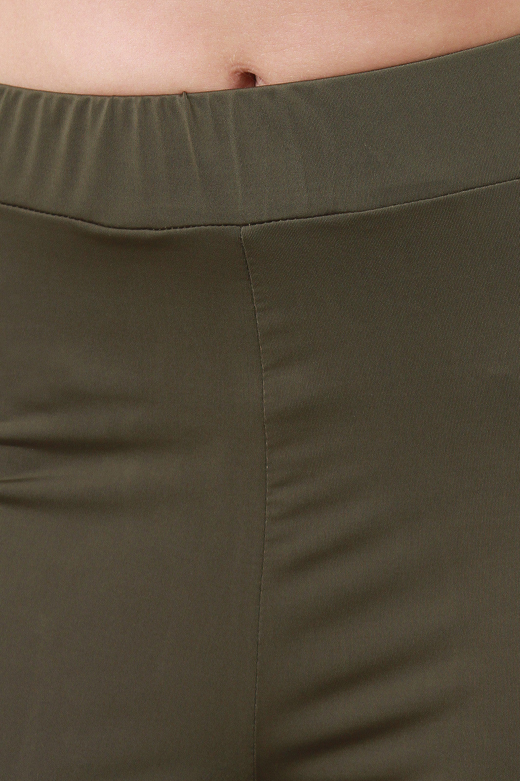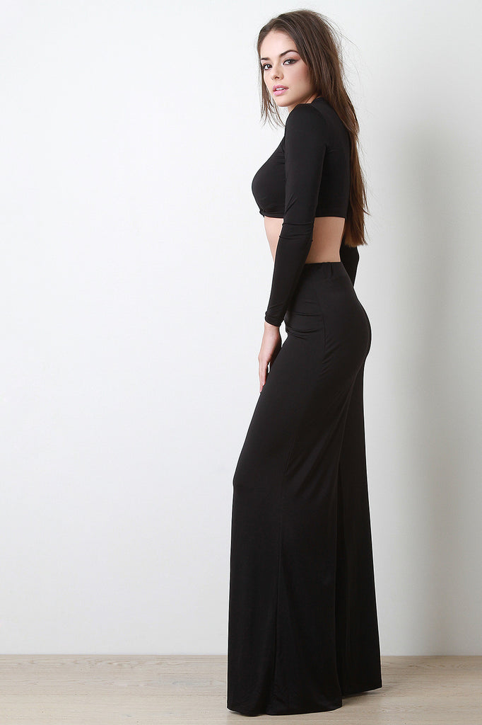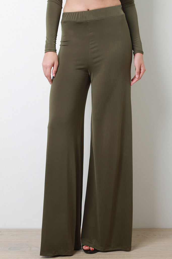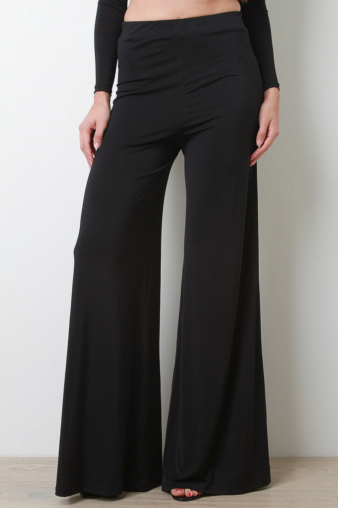 Wide leg pants featuring smooth stretch fabric with a slight sheen and a wide elasticized waistband. Accessories sold separately. Made in U.S.A. 95% Polyester, 5% Spandex.