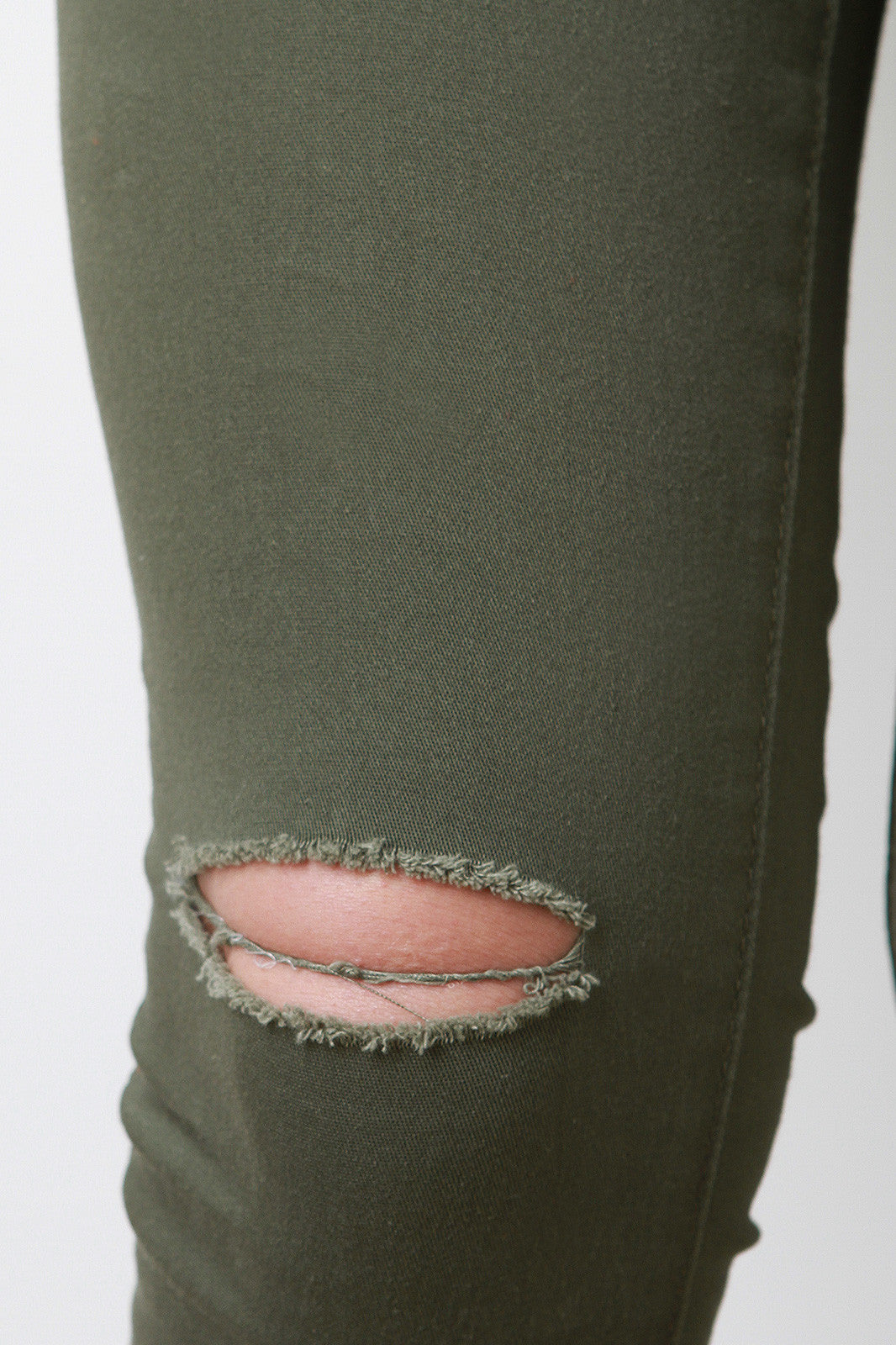 These denim knit fabrication, five belt loops, functional five pocket design, and ripped accents. Accessories sold separately. 97% Cotton, 3% Spandex.
