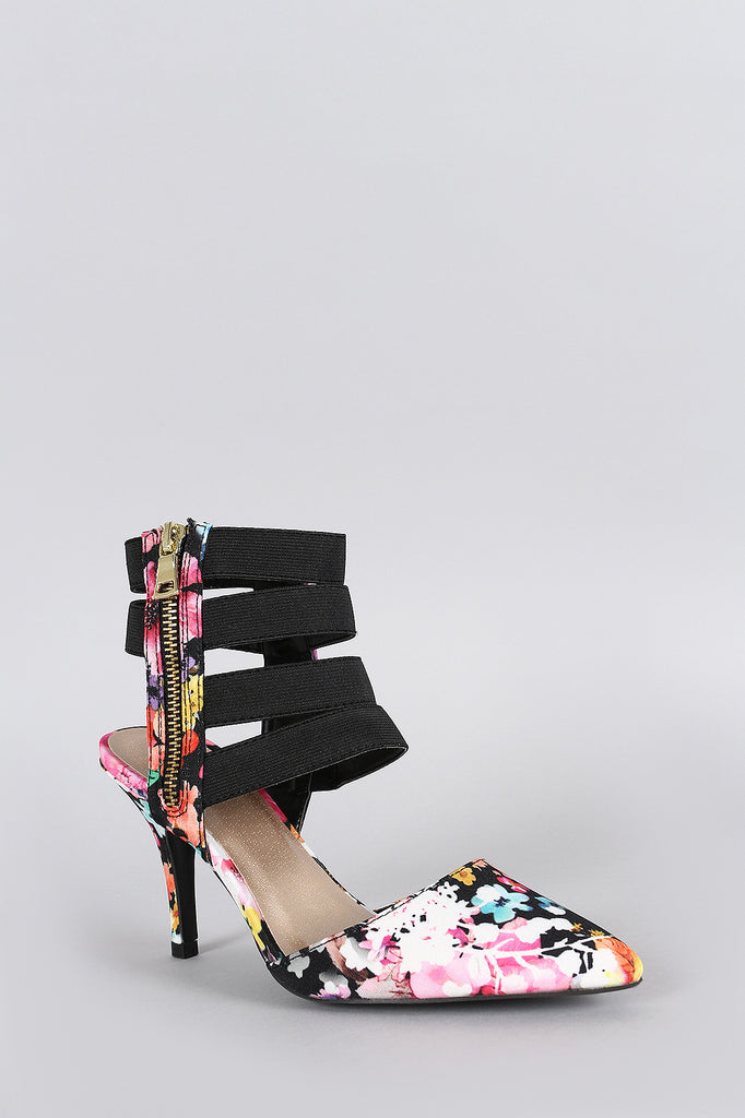 This gorgeous pump features a floral print fabric upper, pointy toe, and strappy ankle cuff with side zipper closure. Finished with lightly padded insole and wrapped heel.Material: Fabric (man-made)Sole: Synthetic