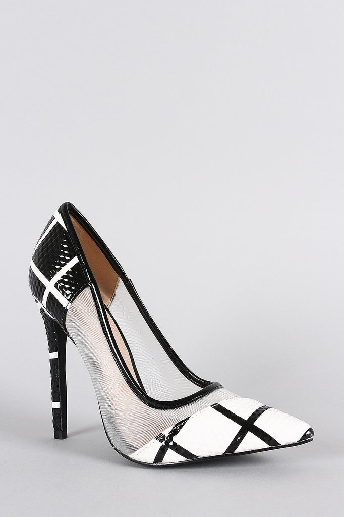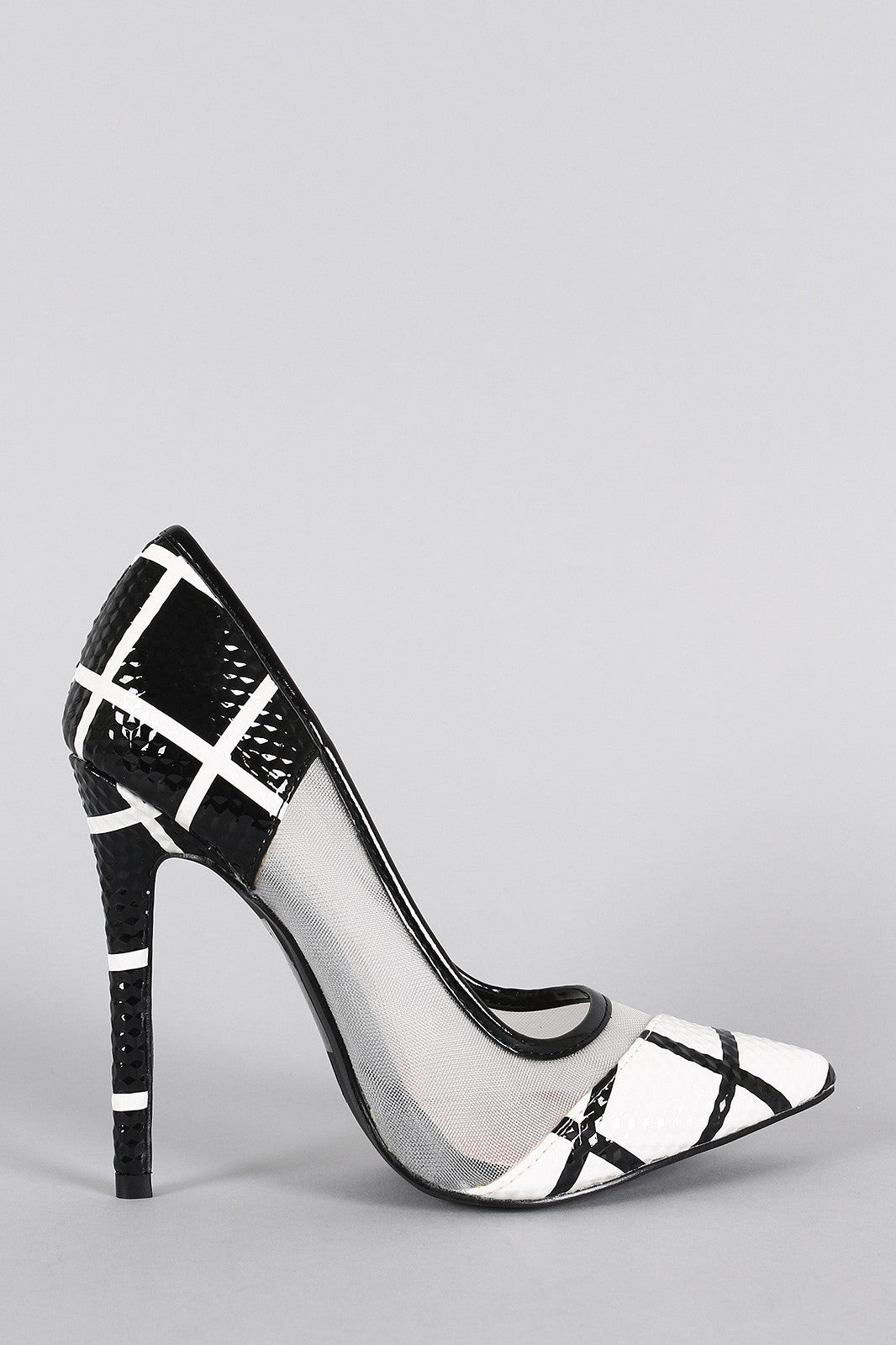 This gorgeous pointy toe , and wrapped stiletto heel. Finished with lightly padded insole and easy slide style.Material: Patent/Mesh (man-made)Sole: Synthetic