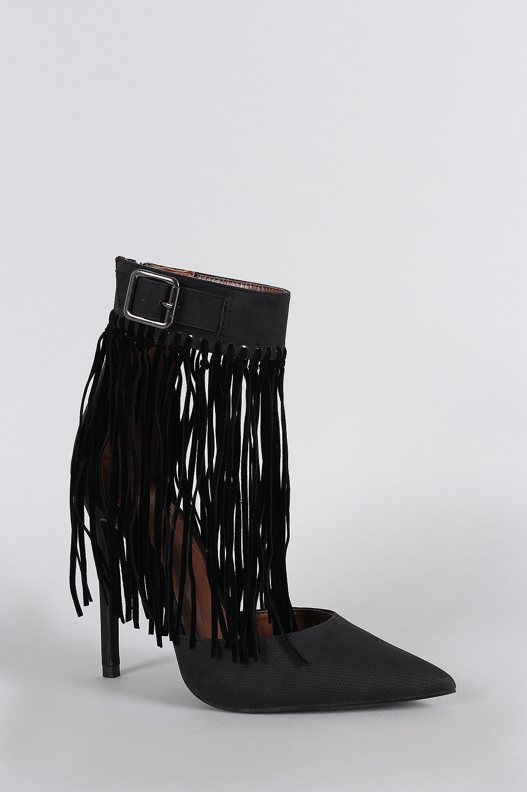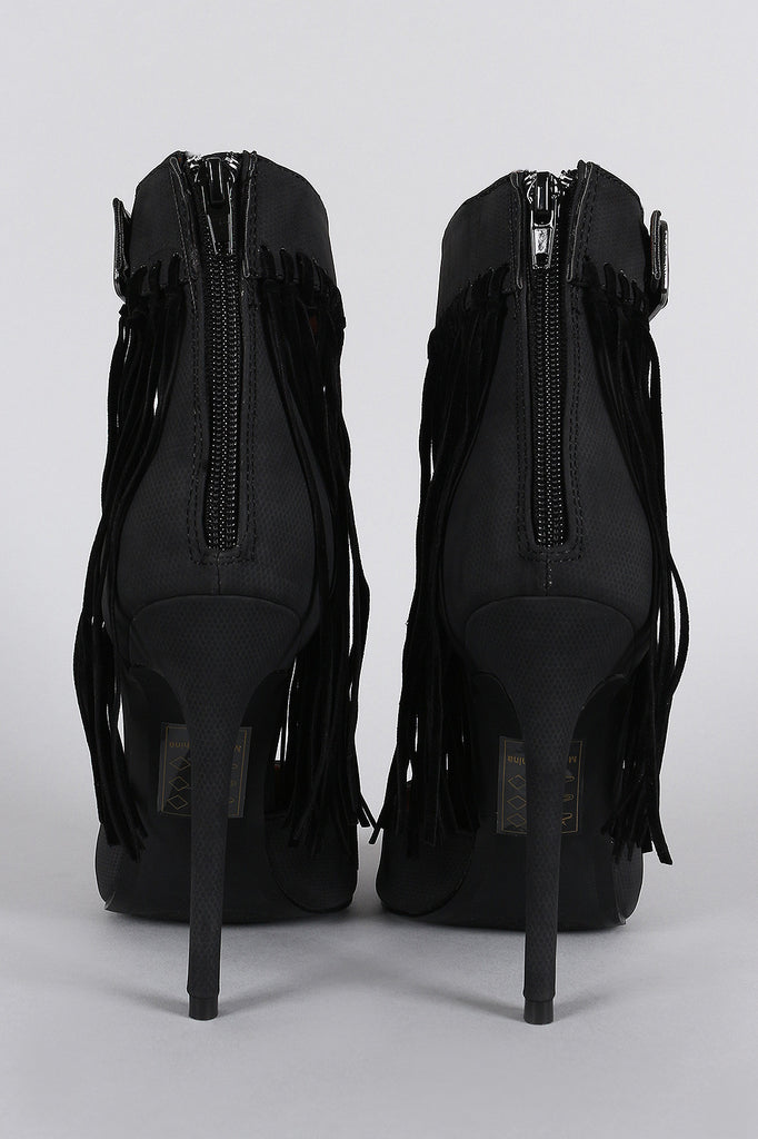 This fringe and an adjustable buckle. Finished with a honey comb pattern print.