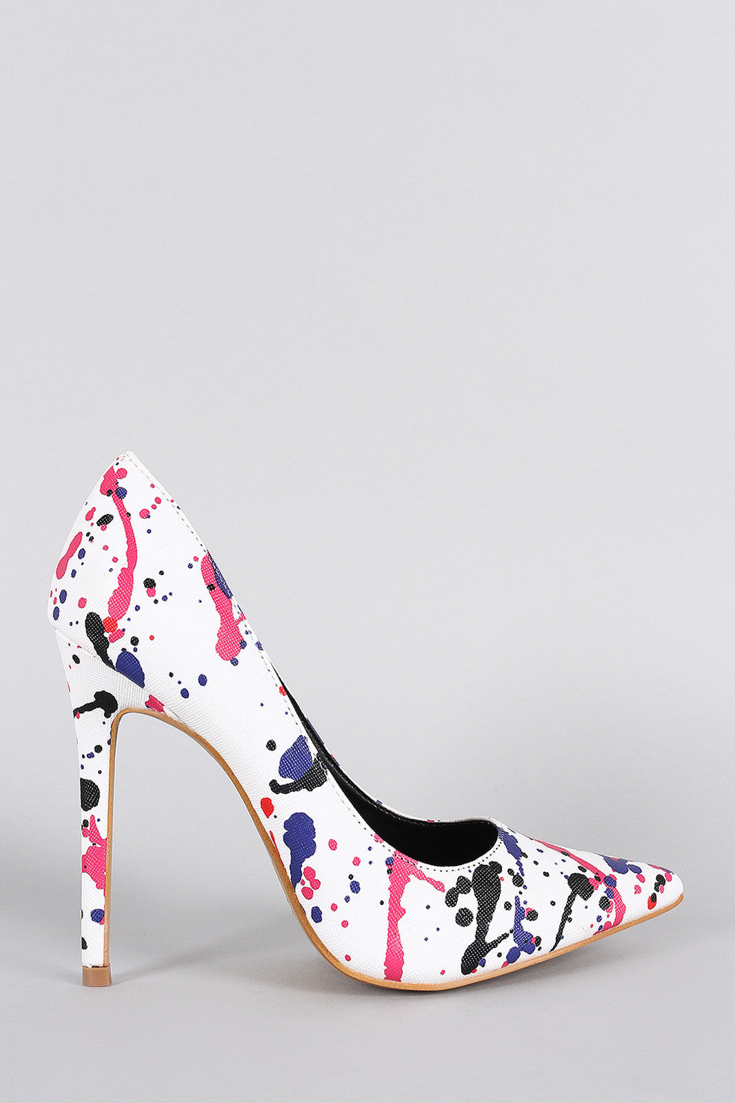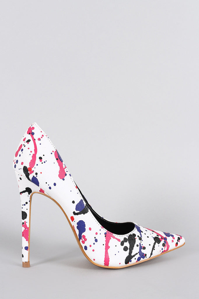 This pointy toe easy on-off wear silhouette. Designed with a blank canvas paint splatter, pattern placement may vary. Finished with a leg-lengthening stiletto heel.