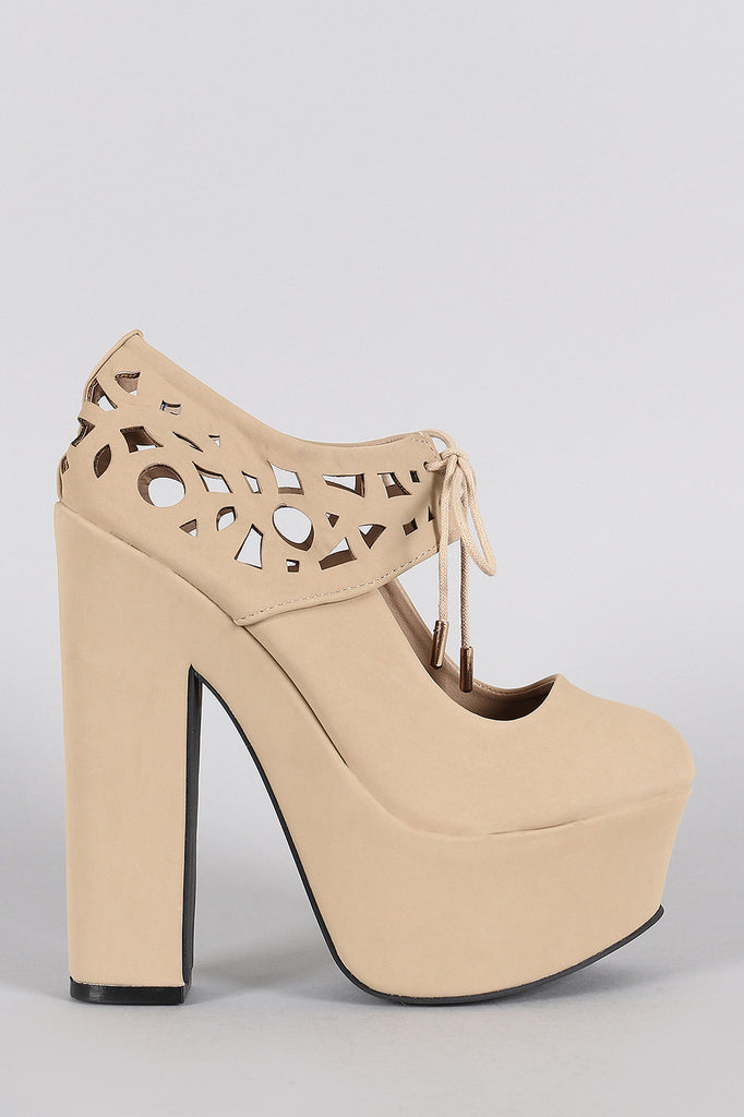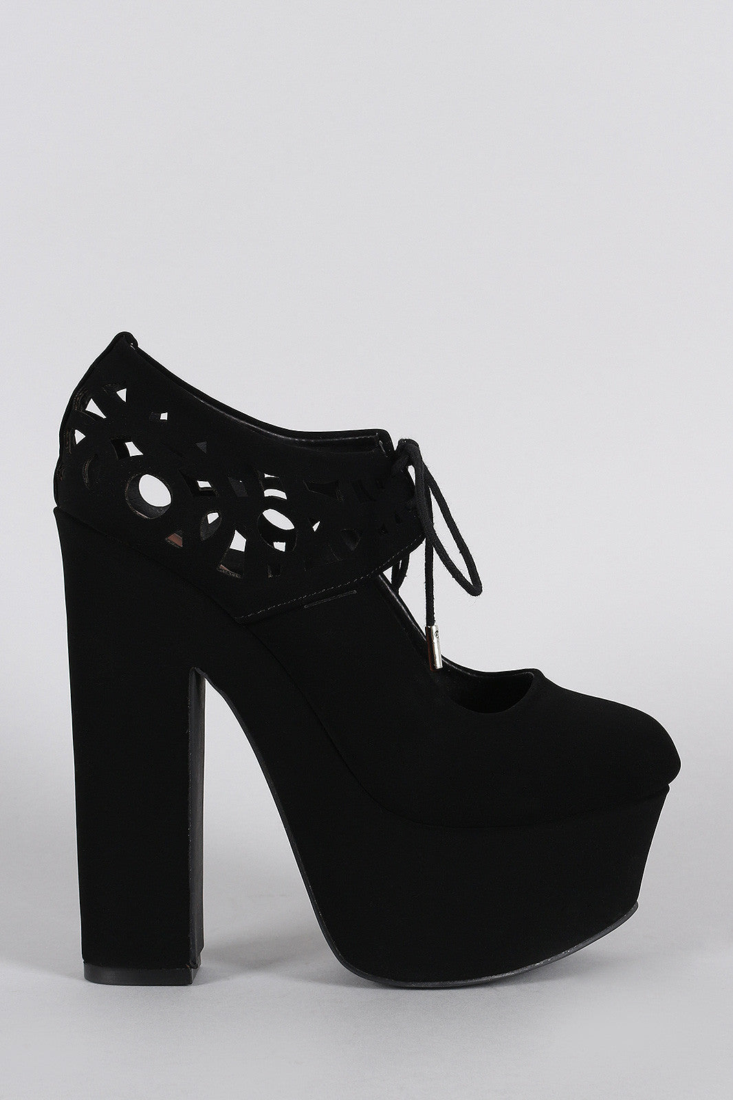 This modern Mary Jane platform and chunky heel. The Mary Jane straps feature geometric cutouts and self tie laces.