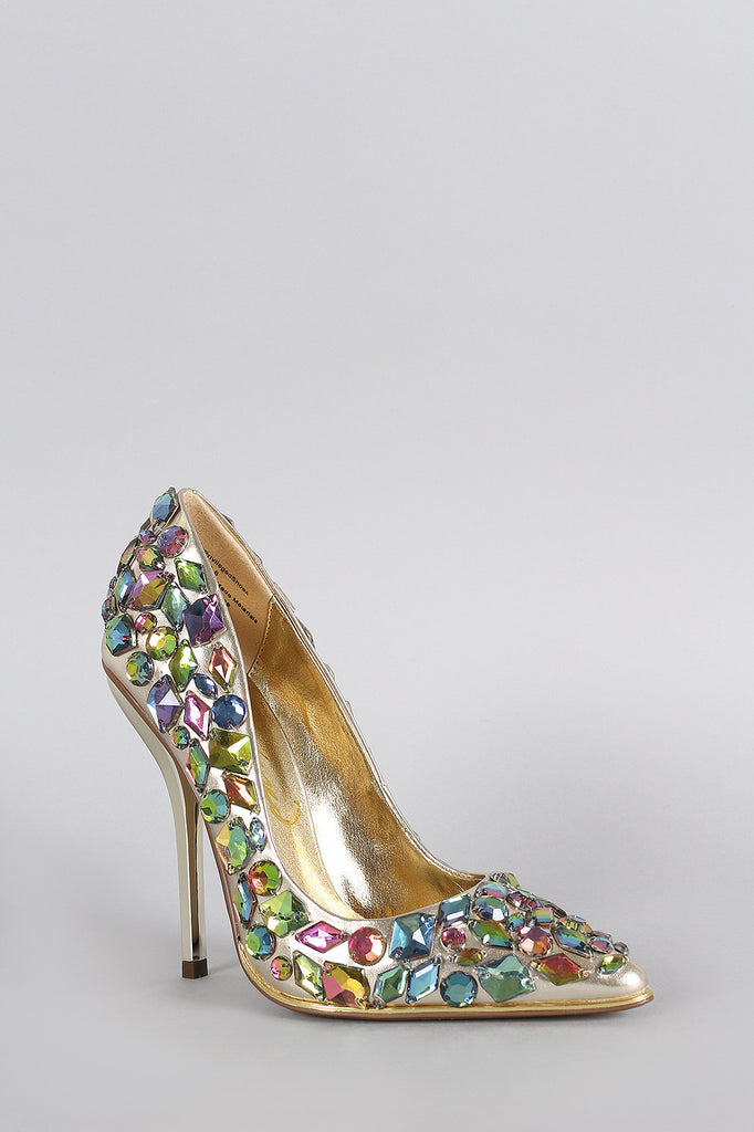 This eye-catching pointy toe silhouette, metallic vegan leather upper with sparkling gemstone embellishment, lightly padded insole, and mirror-like stiletto heel.Material: Metallic Vegan Leather (man-made)Sole: Synthetic