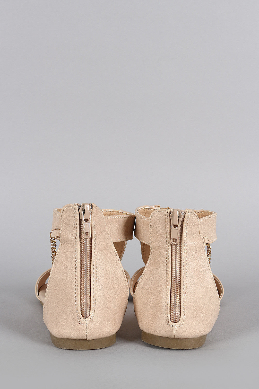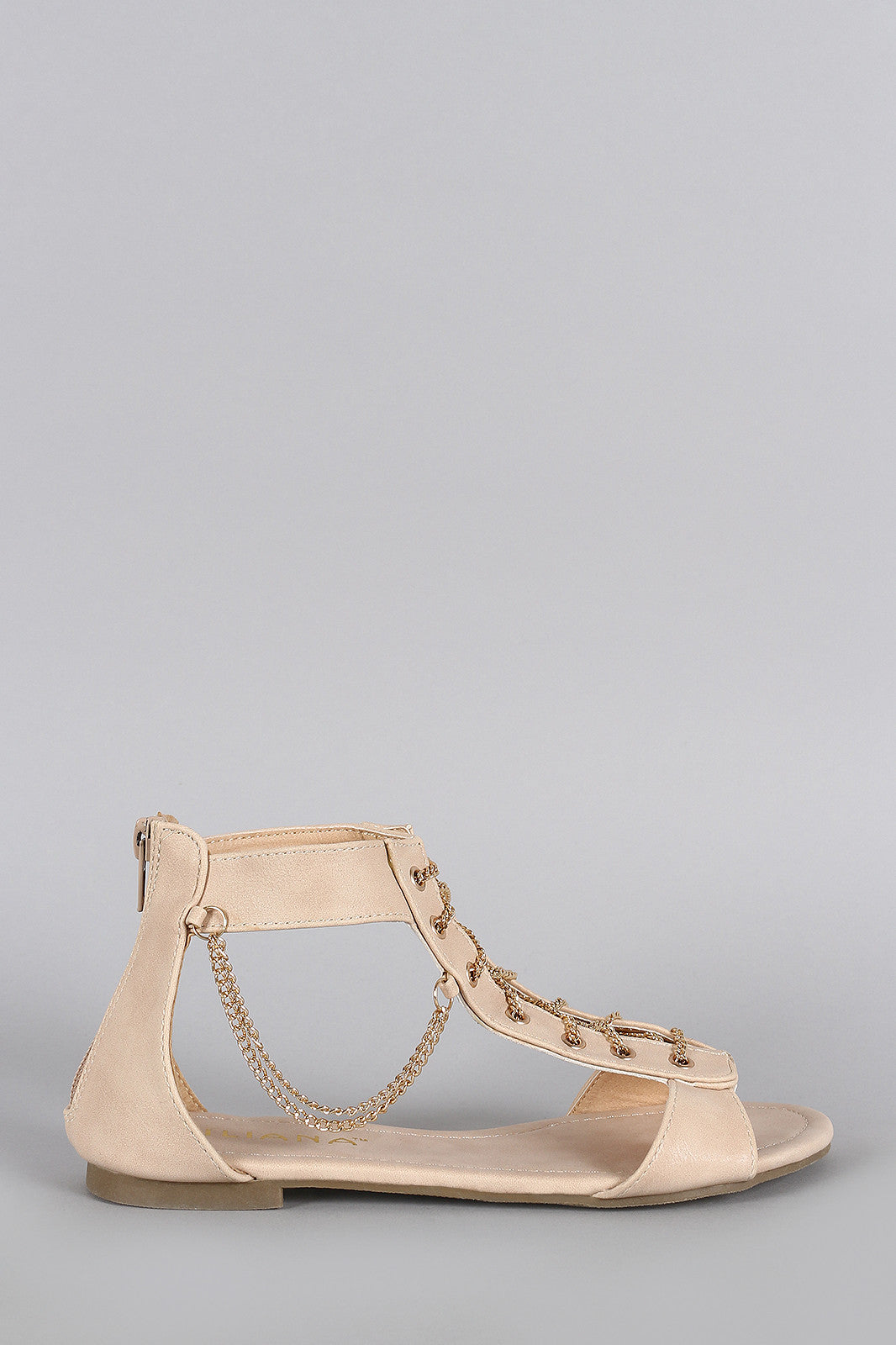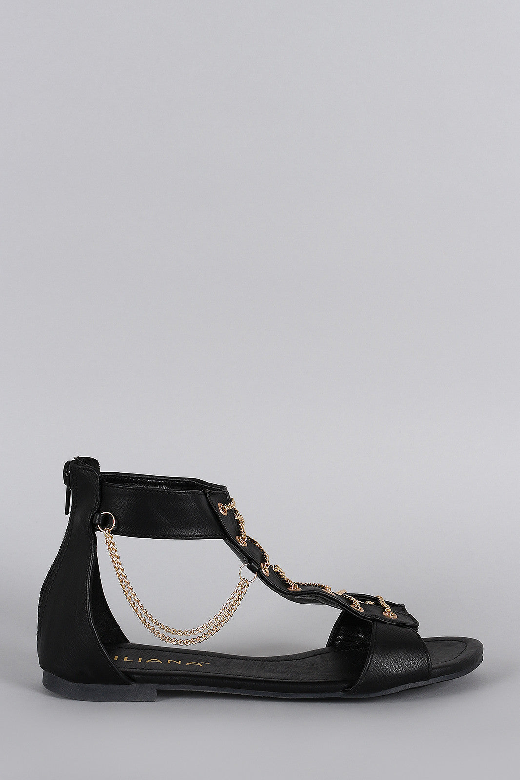 This dangling flat sandal features an open toe , lace up chain design at front vamp, and rear zipper closure for easy on/off. Finished with lightly padded insole for comfort.Material: Leatherette (man-made)Sole: Rubber