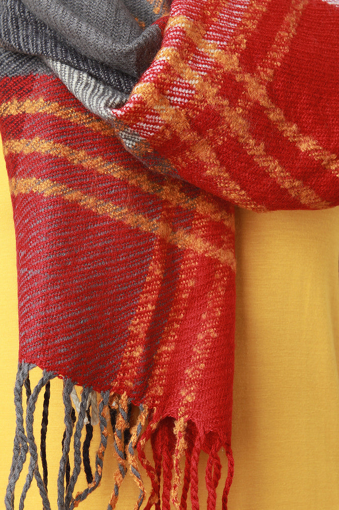 Keep cozy while spectating in this multicolor plaid knit scarf with fringe ends.